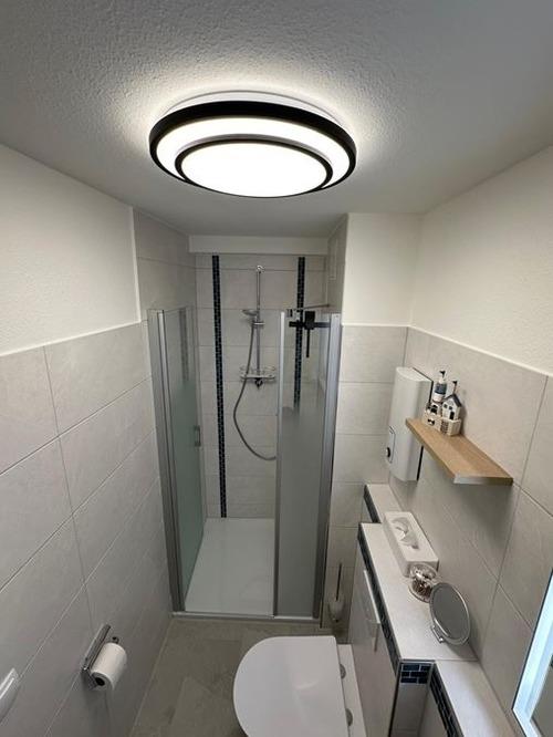 Das Badezimmer ist grau gefliest und mit weißen Sanitärartikeln ausgestattet. Der Waschbeckenunterschrank und das geflieste Sims bietet Ihnen ausreichend Stellfläche und Stauraum, der Handtuchheizkörper wärmt Ihr Handtuch vor. Selbstverständlich sind ein Fön sowie ein Kosmetikspiegel vorhanden.