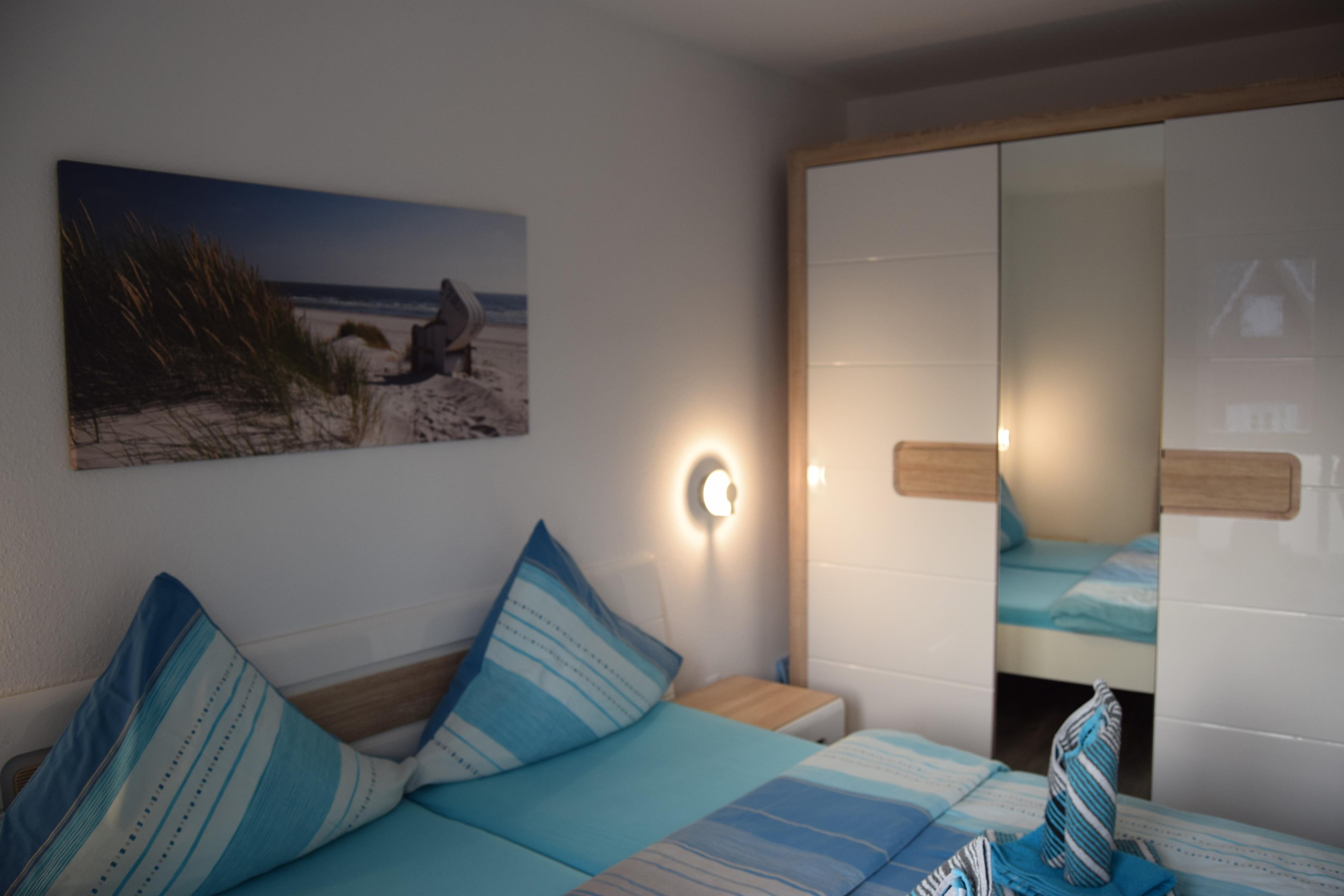 Das mit einer Tür vom Wohnzimmer abgetrennte Schlafzimmer ist mit einem gemütlichen Doppelbett (ca. 180 x 200 cm), Nachtschränken und einem großen Schrank (mit einem eingebauten kleinen Tresor) möbliert. Für Ihren Komfort sind Bettwäsche und Handtücher im Mietpreis inbegriffen. Zum Wäschepaket gehört jeweils ein großes Duschhandtuch, zwei Handtücher sowie eine Duschmatte und ein Geschirrhandtuch. Zusätzlich finden Sie ein Bügeleisen mit Bügelbrett vor.