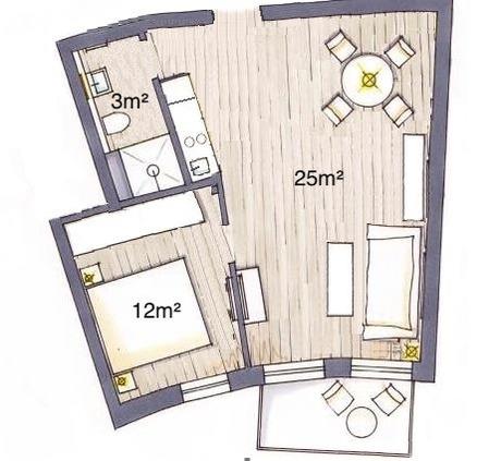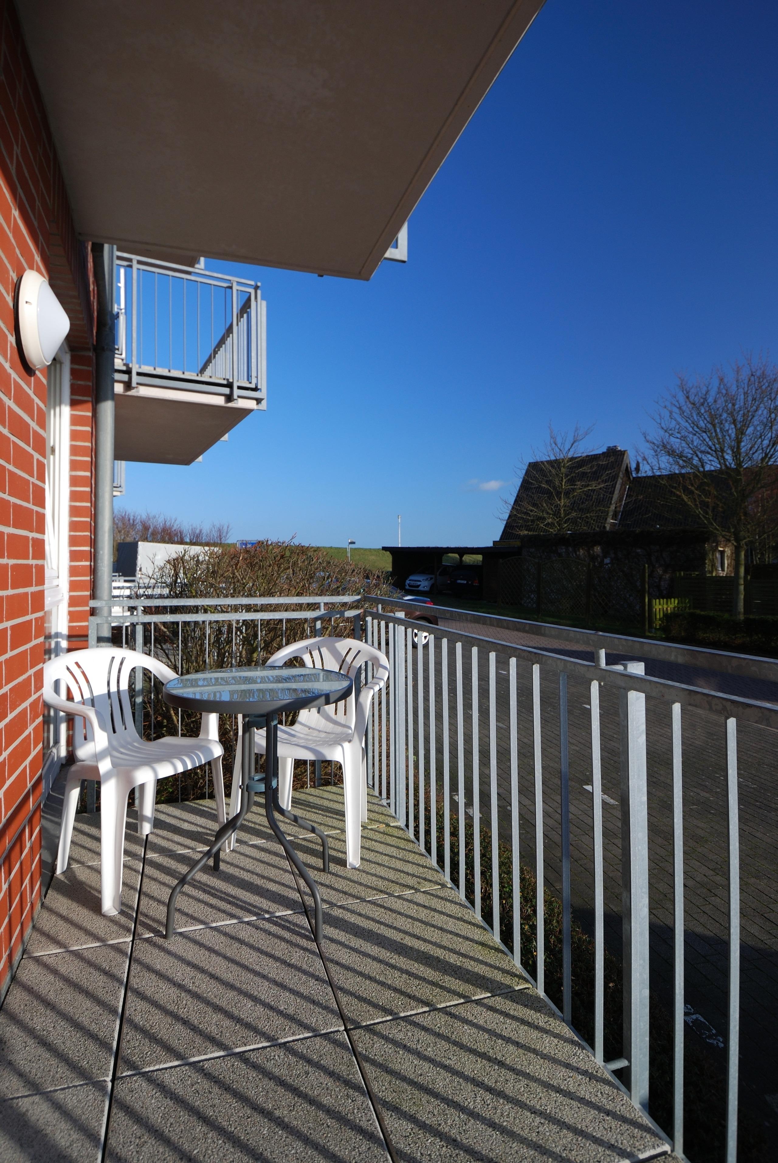 Vom Wohnzimmer aus betreten Sie den Balkon, der mit Stühlen und einem kleinen Tisch möbliert ist.
