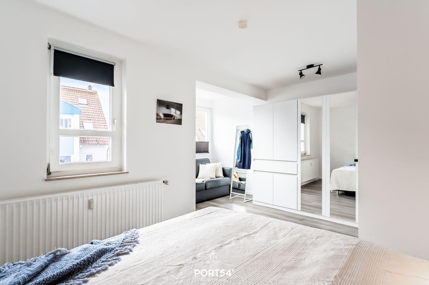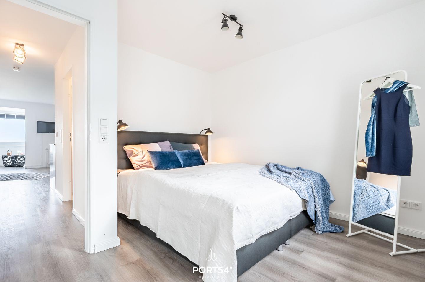 Das Schlafzimmer ist mit einem luxuriösen Boxspringbett (1,80 × 2 m) und einem geräumigen Kleiderschrank ausgestattet.