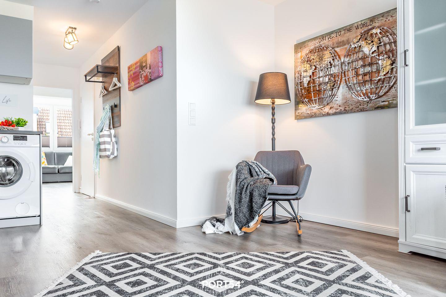 Zur Ausstattung gehört ein eigener Strandkorb am Strand (saisonabhängig) sowie ein eigener PKW-Stellplatz (Nr. 32), damit du dein Fahrzeug sicher abstellen kannst. Außerdem steht dir eine Waschmaschine in der Wohnung zur Verfügung.