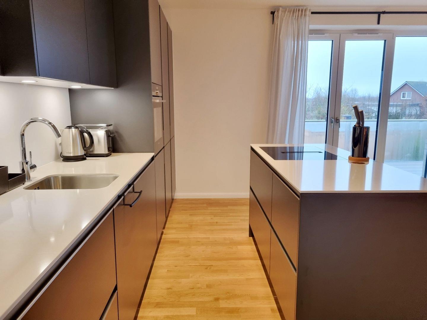 Küche: sehr großzügige Küche mit Kochinsel / Dunstabzug in das Induktionsfeld integriert / Backofen mit integrierter Mikrowelle / Geschirrspüler / Toaster / Filterkaffeemaschine / Wasserkocher / Kühlschrank / separierter halber Gefrierschrank mit 3-Fächern