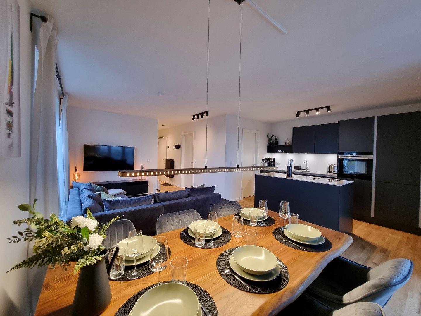 Das Ferienappartement liegt im 1. Stock und verfügt auf großzügigen 70qm über zwei Schlafzimmer, einen Wohn-Essbereich mit offener Küche und ein Duschbad. Im Außenbereich befindet sich ein zur Sonnenseite ausgerichteter Balkon, der über den Wohnbereich erreichbar ist. Außerdem steht den Gästen der Appartementanlage ein gemeinschaftlich nutzbarer Fahrradkeller zur Verfügung. Ein Hund ist in der Ferienwohnung herzlich Willkommen und darf gerne mit in den Urlaub fahren.