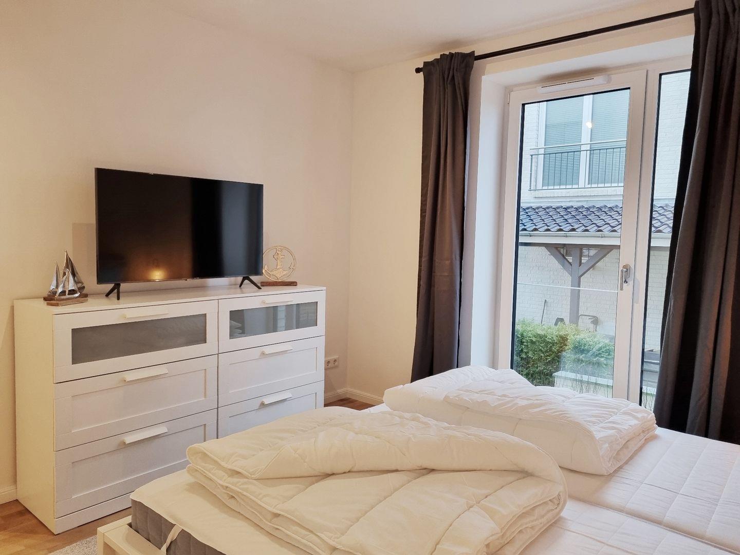 Schlafzimmer I: Doppelbett / Schrank / Kommode / Fernseher / Verdunkelungsgardinen