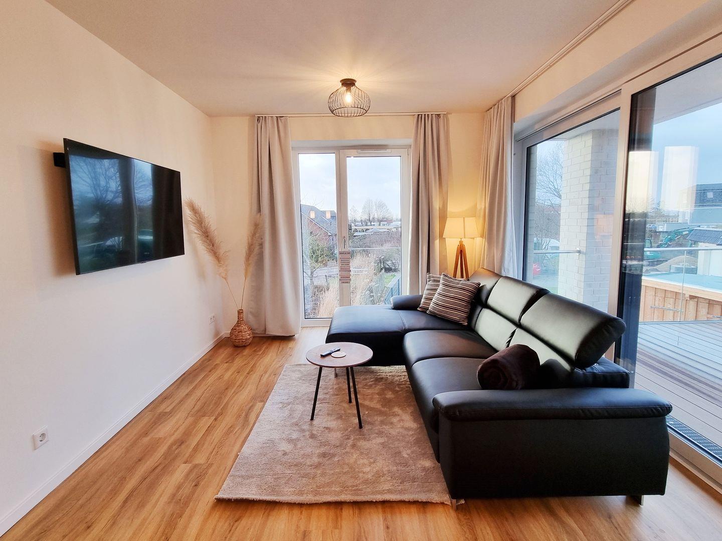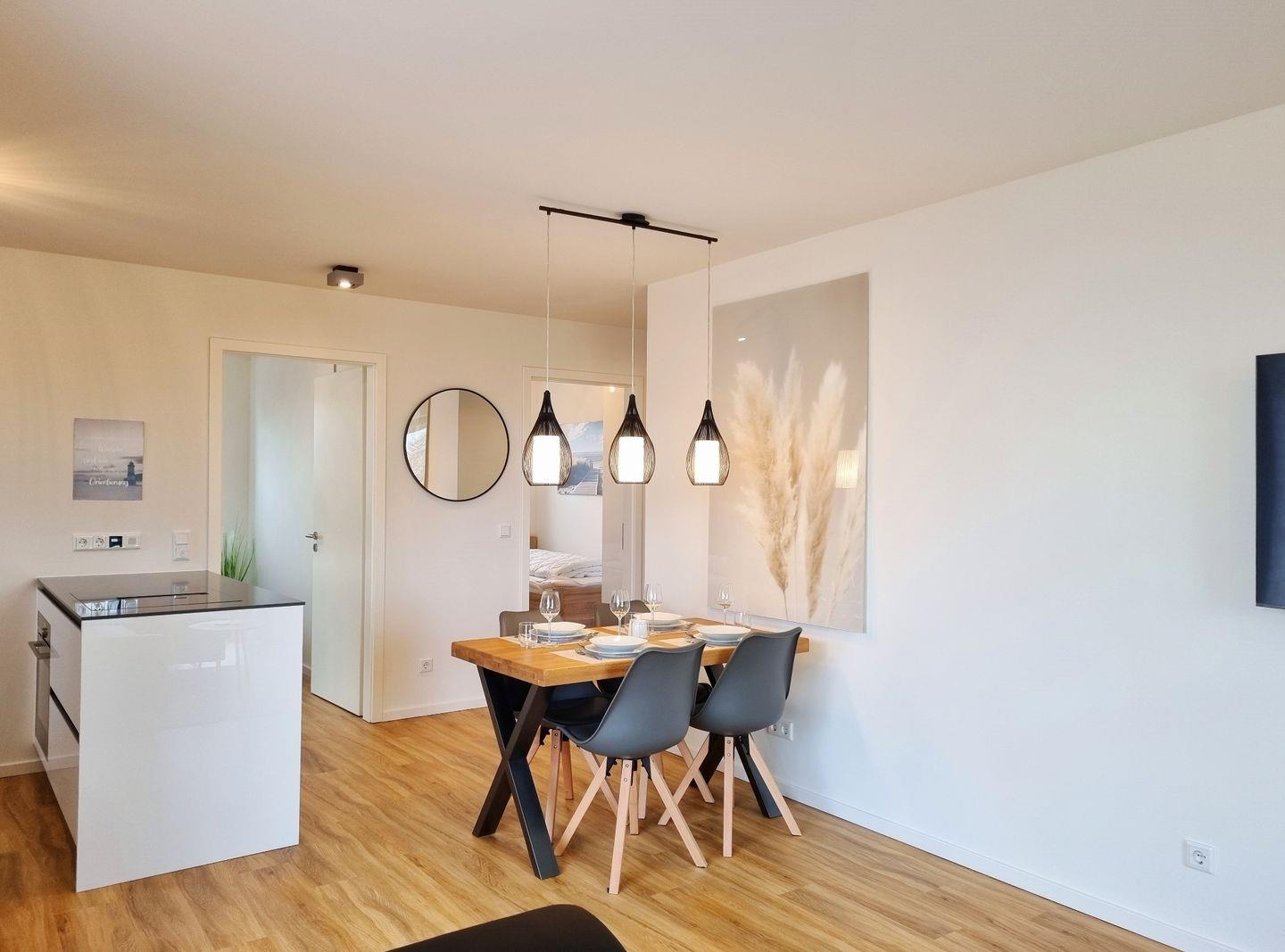 Euch erwartet eine 3-Zimmer-Wohnung mit zwei Schlafzimmern, einem Duschbad, einem Wohn-Essbereich mit offener Küche und der großzügigen Balkon. Das Appartement ist für 4 Personen (+ eine zusätzliche Person) geeignet. Die Schlafzimmer teilen sich in ein Doppelbettzimmer und ein Zweibettzimmer, außerdem kann die Couch im Wohnzimmer zur Schlafcouch ausgeweitet werden. Ein eigener PKW-Stellplatz ist direkt am Haus und auch WLAN ist selbstverständlich inklusive. Zwei Hunde sind herzlich willkommen.