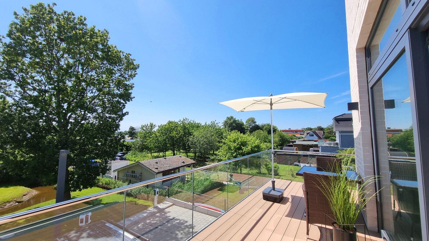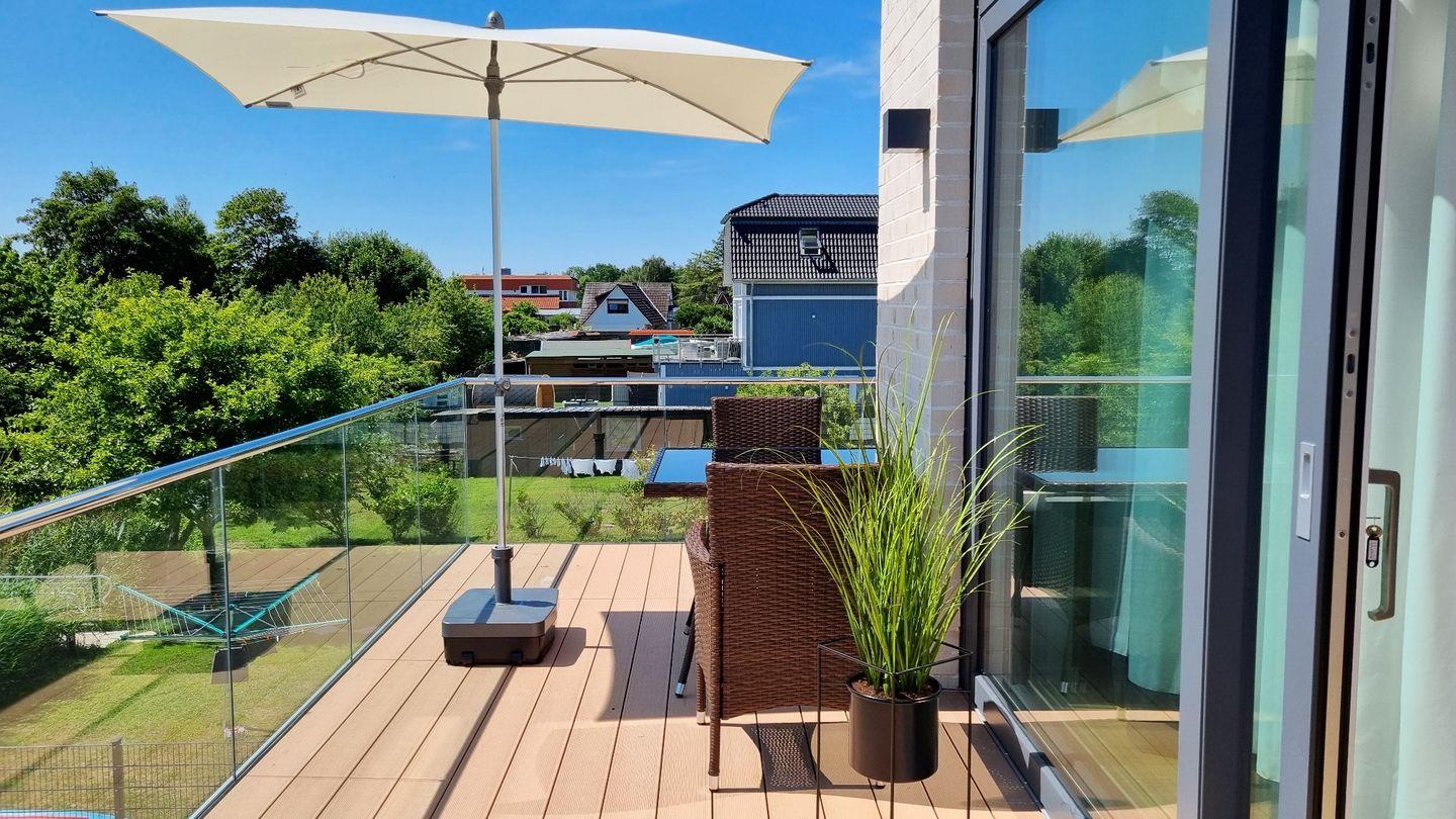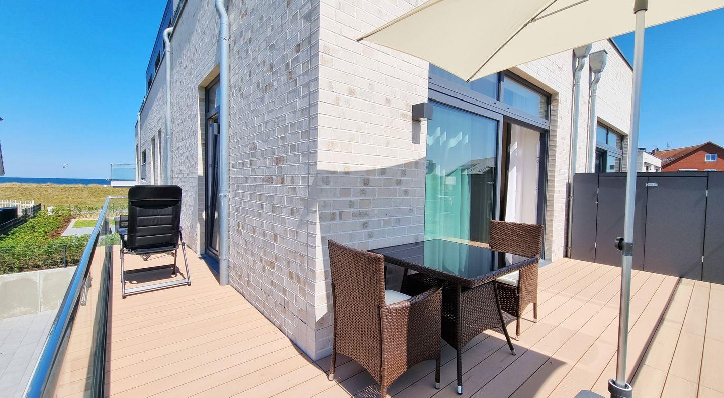 Auf dem großen Sonnenbalkon in Südlage, startet und endet jeder Tag mit Entspannung und Meeresrauschen. Der Balkon zieht sich in L-Form um die Hauswand, so dass ein schöner Meerblick auf die Ostsee sichtbar wird. Neben der Sitzgruppe steht ein Hochlehner mit Fußschemel bereit.