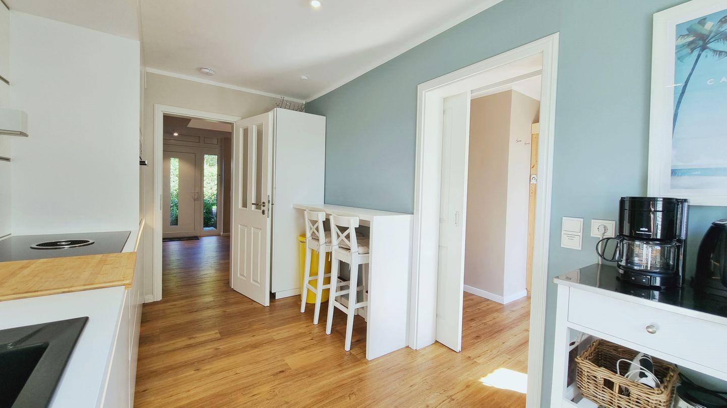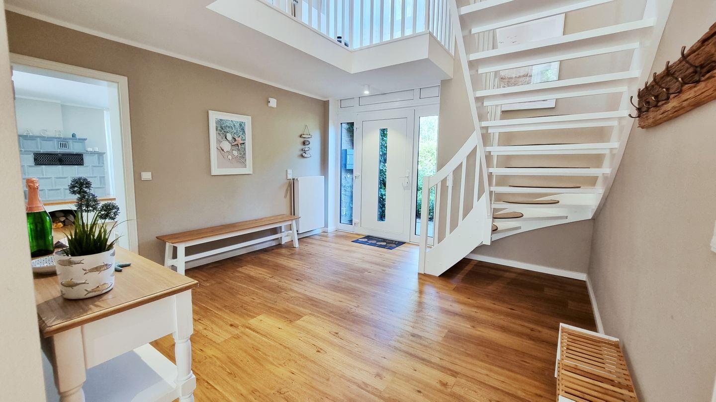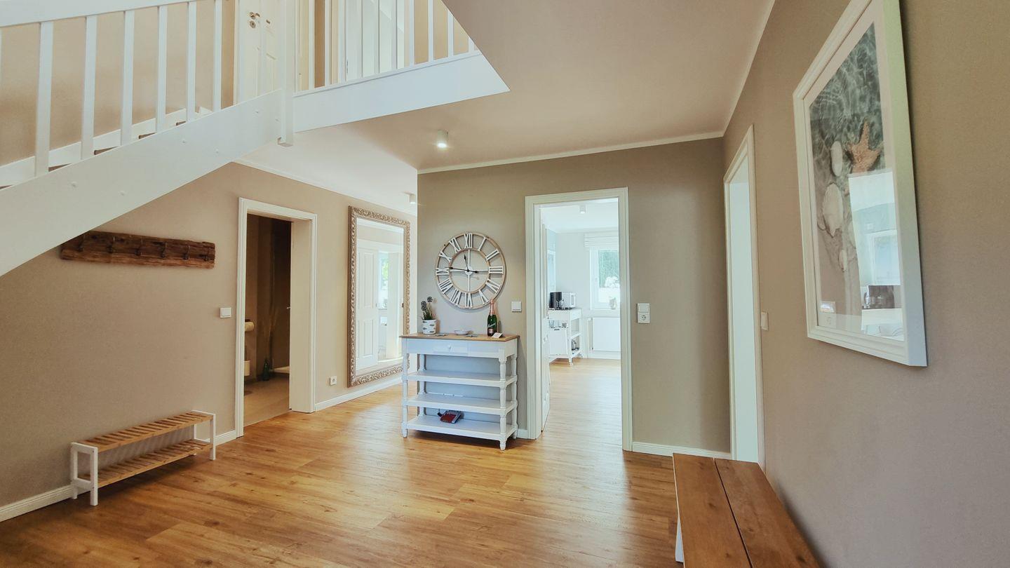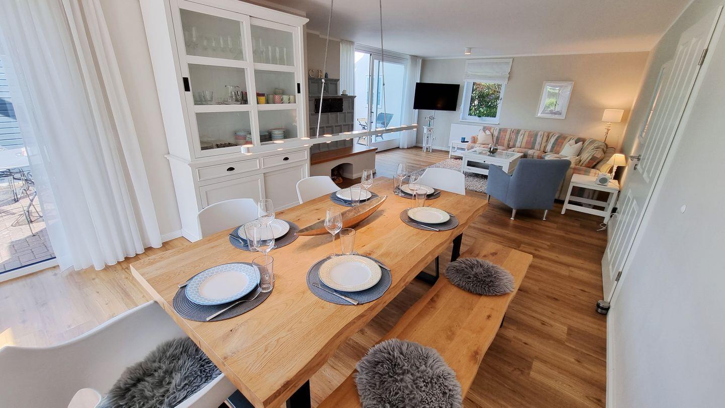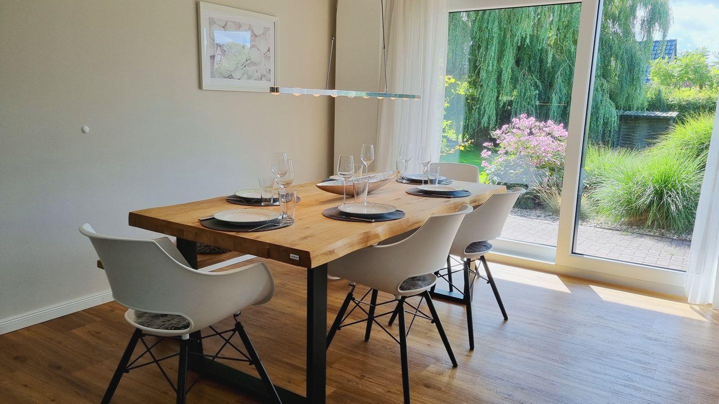 Im 160qm großen Domizil finden bis zu 6 Personen (+Baby) Platz. Im Erdgeschoss lädt der weitläufige Wohnbereich mit riesigem Ecksofa zum Entspannen und Beisammensein ein. Die hochmoderne und top ausgestattete Küche lässt keine Wünsche offen, um kulinarische Köstlichkeiten zuzubereiten. Gemütlich gegessen wird dann am Echtholztisch mit Blick in den grünen Garten.