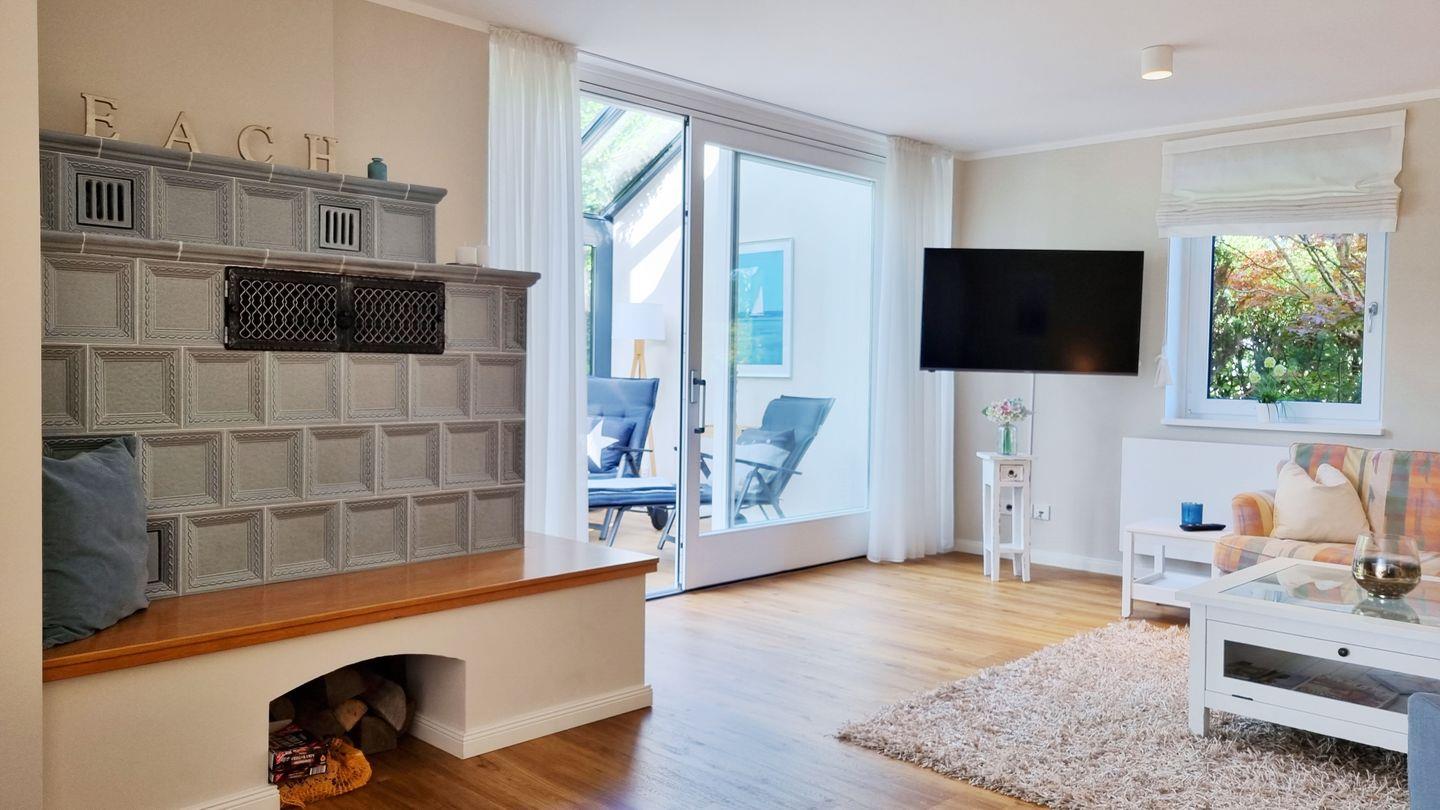 Wohn- Essbereich: großes Ecksofa / Fernseher / Esstisch / 4 Stühle / Sitzbank / Kaminofen
