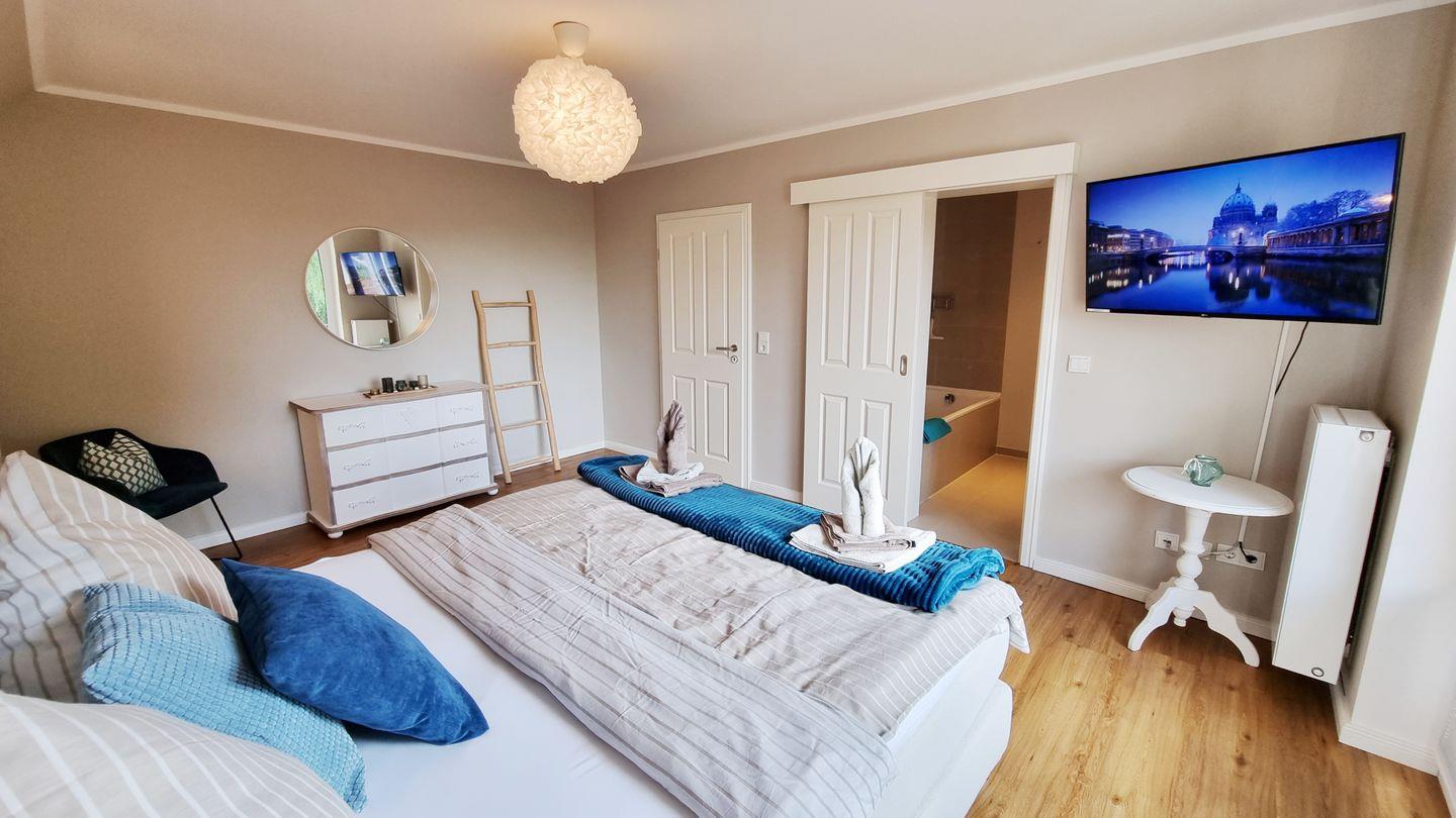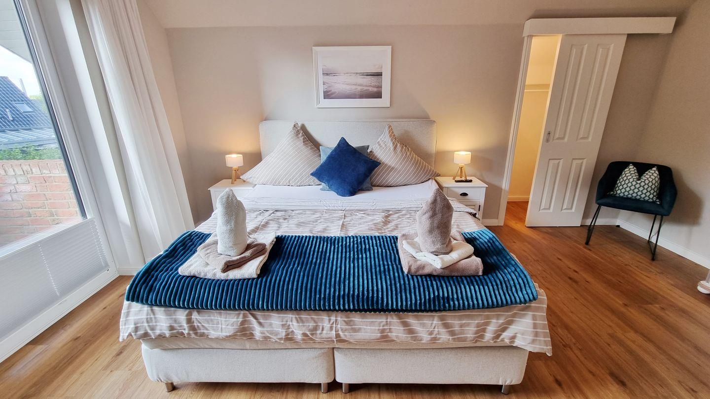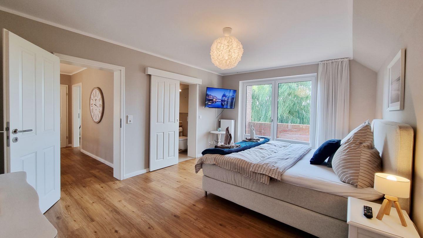 Schlafzimmer II: Boxspring-Doppelbett (180x200cm) / begehbarer Schrank / Fernseher / Verdunkelungsgardinen / Wannenbad en Suite / Balkon