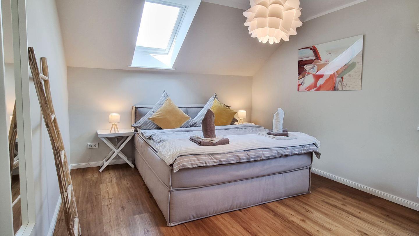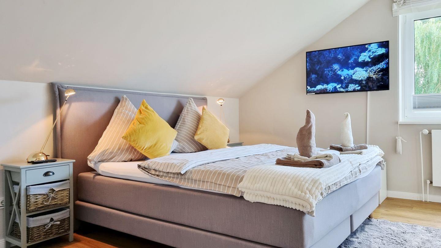Schlafzimmer III: Boxspring-Doppelbett (180x200cm) / Schrank / Fernseher / Verdunkelungsgardinen / Velux-Fenster
