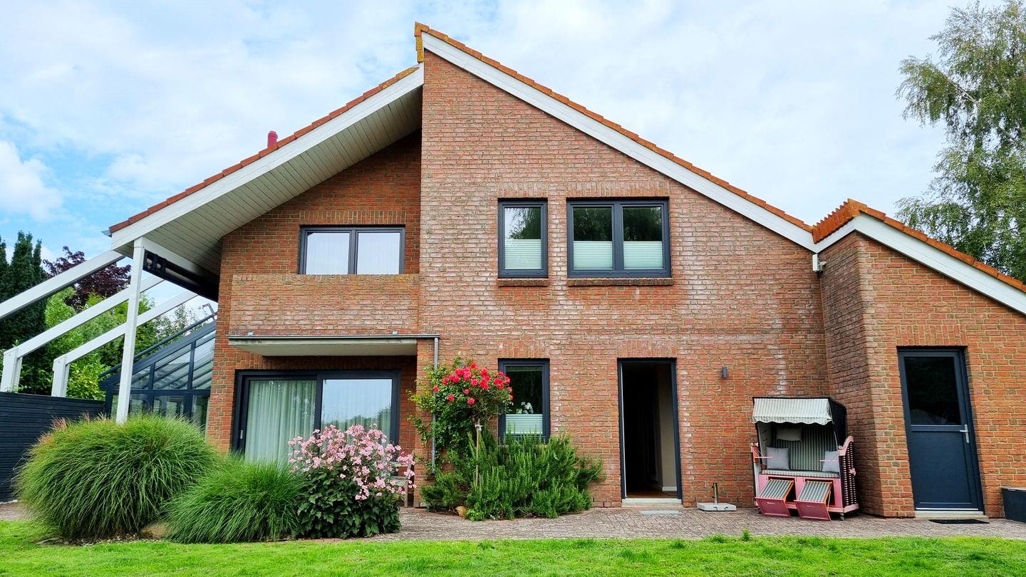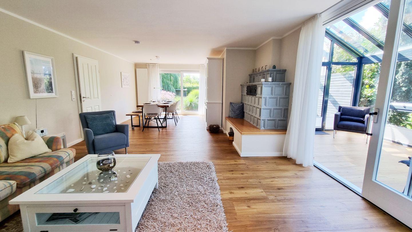 Auch an stürmischen Tagen sorgt der stylische Kaminofen für wohlige Wärme und der angrenzende Wintergarten eignet sich hervorragend zum Abschalten bei einem guten Buch. Damit der erholsame Schlaf nicht zu kurz kommt, stehen insgesamt 3 Doppelbettzimmer mit Boxspringbetten zur Verfügung, on top haben zwei der Schlafzimmer ein Bad en Suite. Insgesamt befinden sich 3 Badezimmer im Haus, davon zwei Duschbäder und ein Wannenbad, so hat jede Partei ein Badezimmer für sich, wobei sich ein Duschbad im EG befindet.