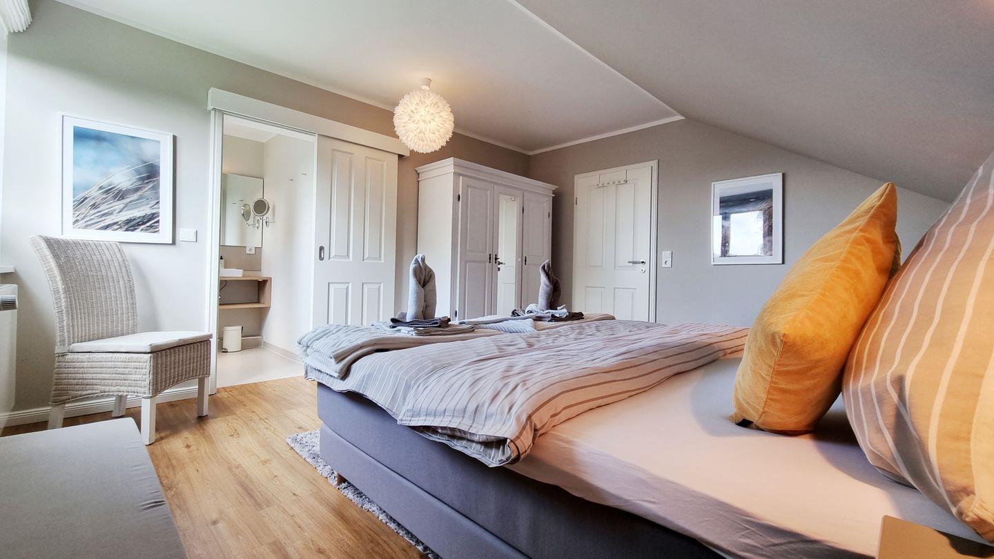 Schlafzimmer I: Boxspring-Doppelbett (180x200cm) / Schrank / Fernseher / Verdunkelungsgardinen / Duschbad en Suite