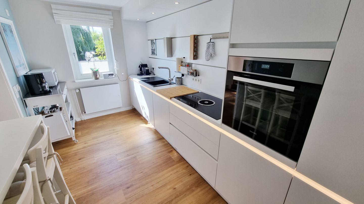 Küche: hochmoderne Küche / Bora-Dunstabzug in das Induktionskochfeld integriert / Backofen / Mikrowelle / Geschirrspüler / Toaster / Filterkaffeemaschine / Nespresso-Kapselmaschine / Wasserkocher / Kühlschrank mit Gefrierfach / Mixer