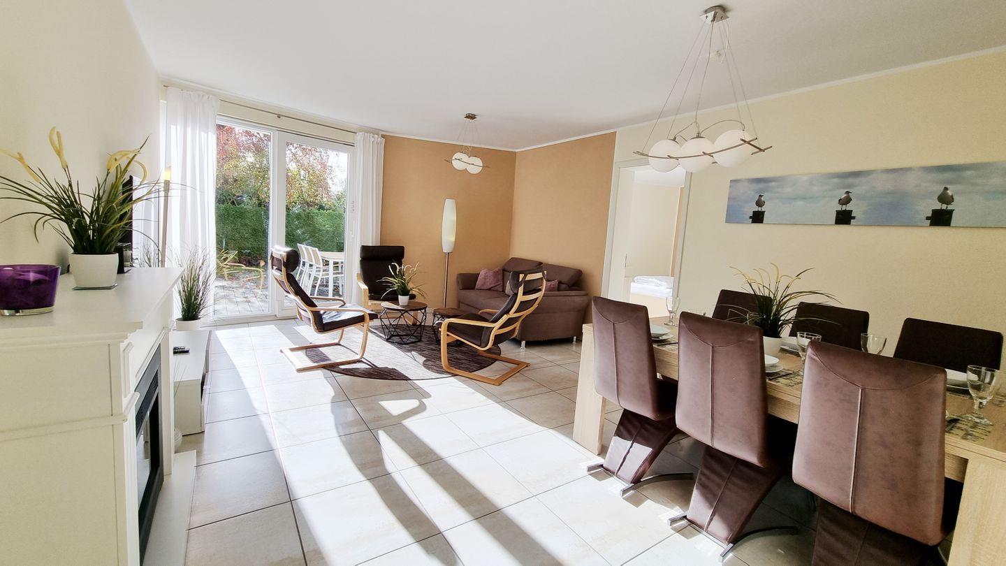 Moderne Erdgeschoss Ferienwohnung „Baltic Sunshine“ punktet mit großem, eingezäunten Sonnengarten nebst Terrasse in direkter Nähe zum Ostseestrand.