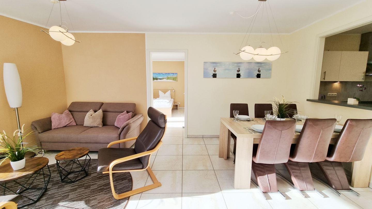 Die moderne Erdgeschoss-Ferienwohnung „Baltic Sunshine“ bietet euch auf 104 qm Platz für bis zu 6 Personen + Baby und 2 Hunde. Mit 3 Schlafzimmern, 2 Bädern, Gäste-WC, großem Wohn-Essbereich mit Elektrokamin, voll ausgestatteter Küche und eingezäuntem Sonnengarten seid ihr nur 50 m vom Ostseestrand entfernt. Grill, Strandkorb und Liegewiese inklusive.