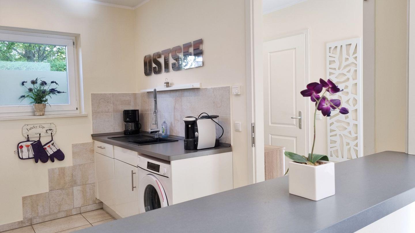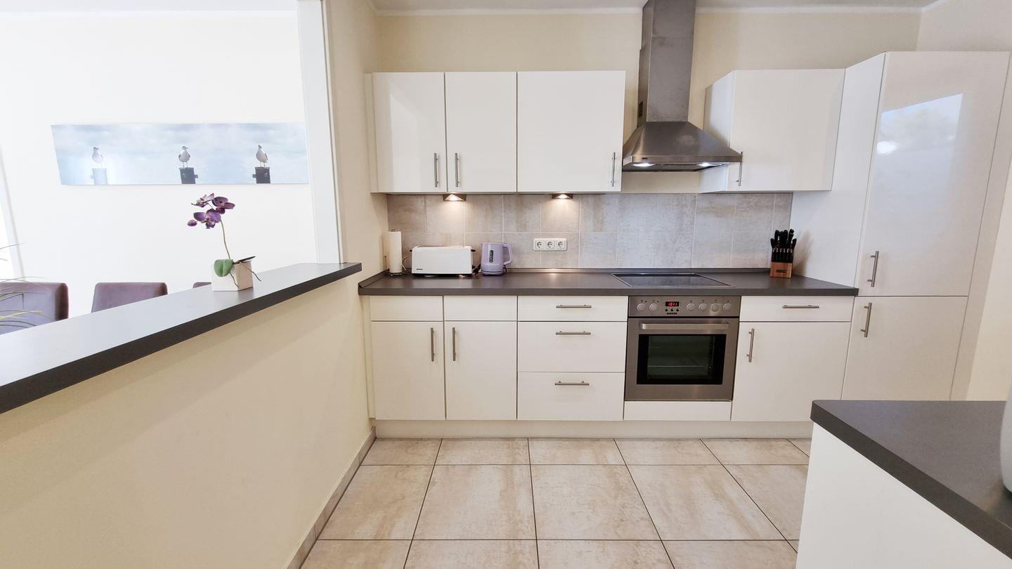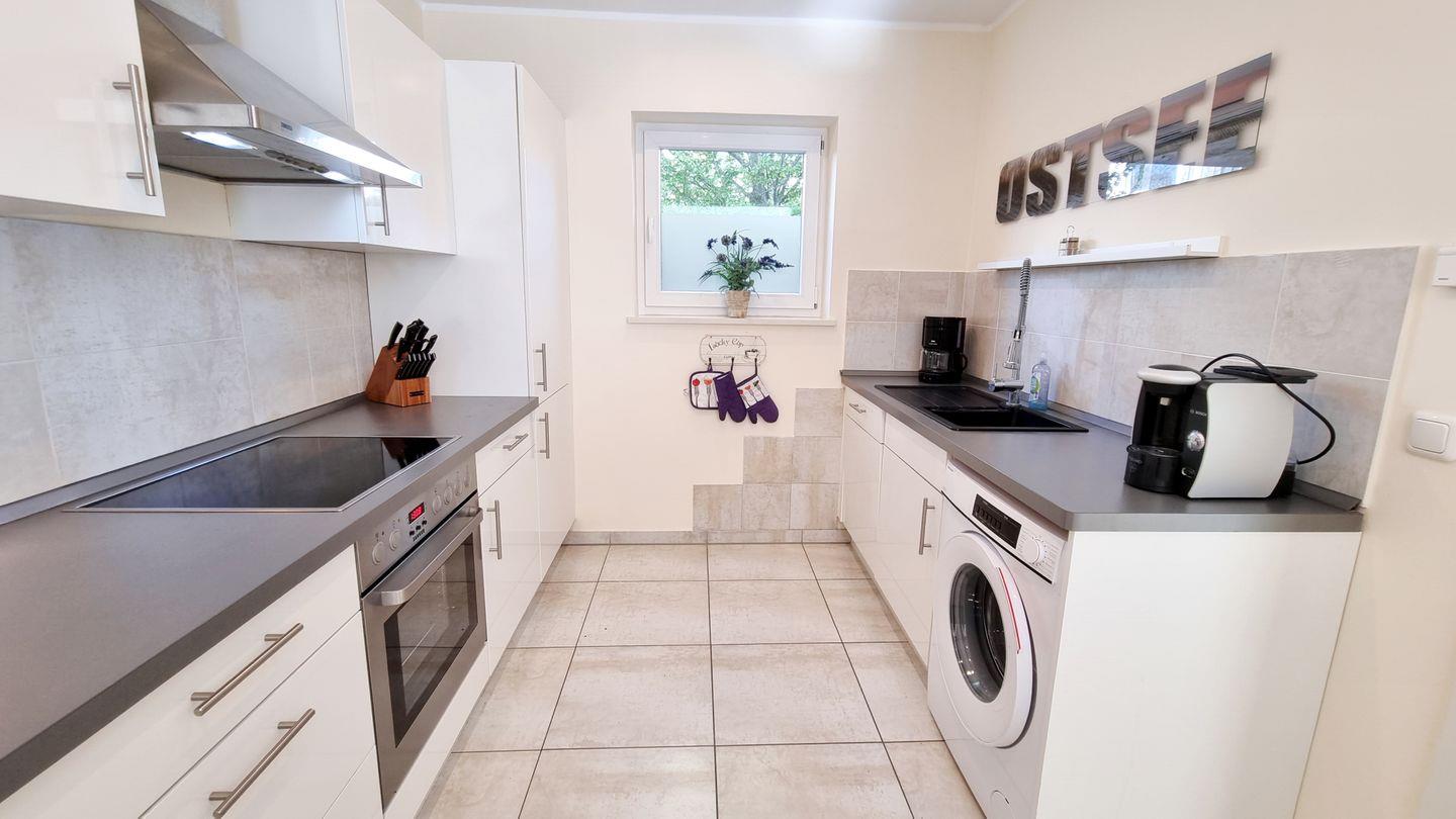 Die hochwertige, vollausgestattete Küche wird durch eine große Durchreiche in den Wohnbereich und ein Fenster auf der gegenüberliegenden Seite mit Helligkeit versorgt.