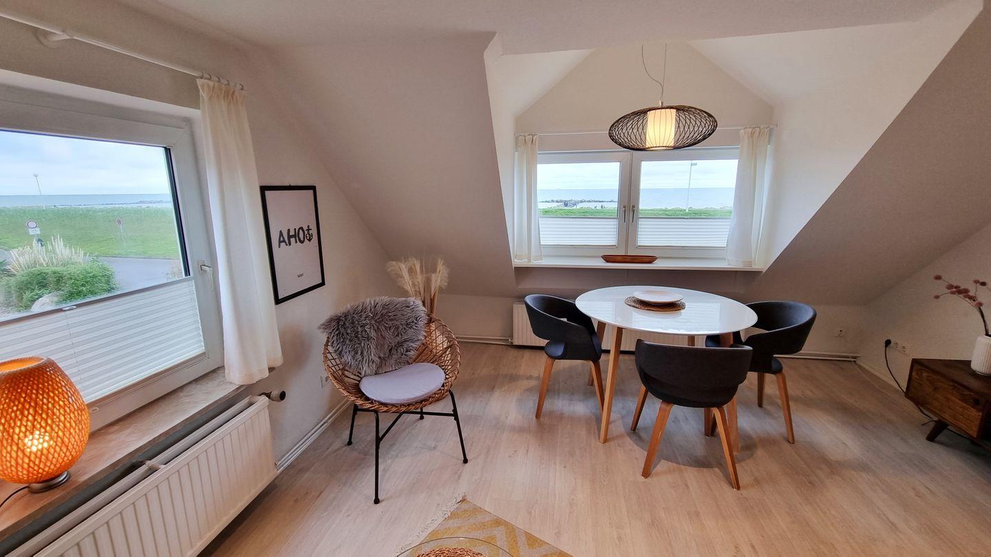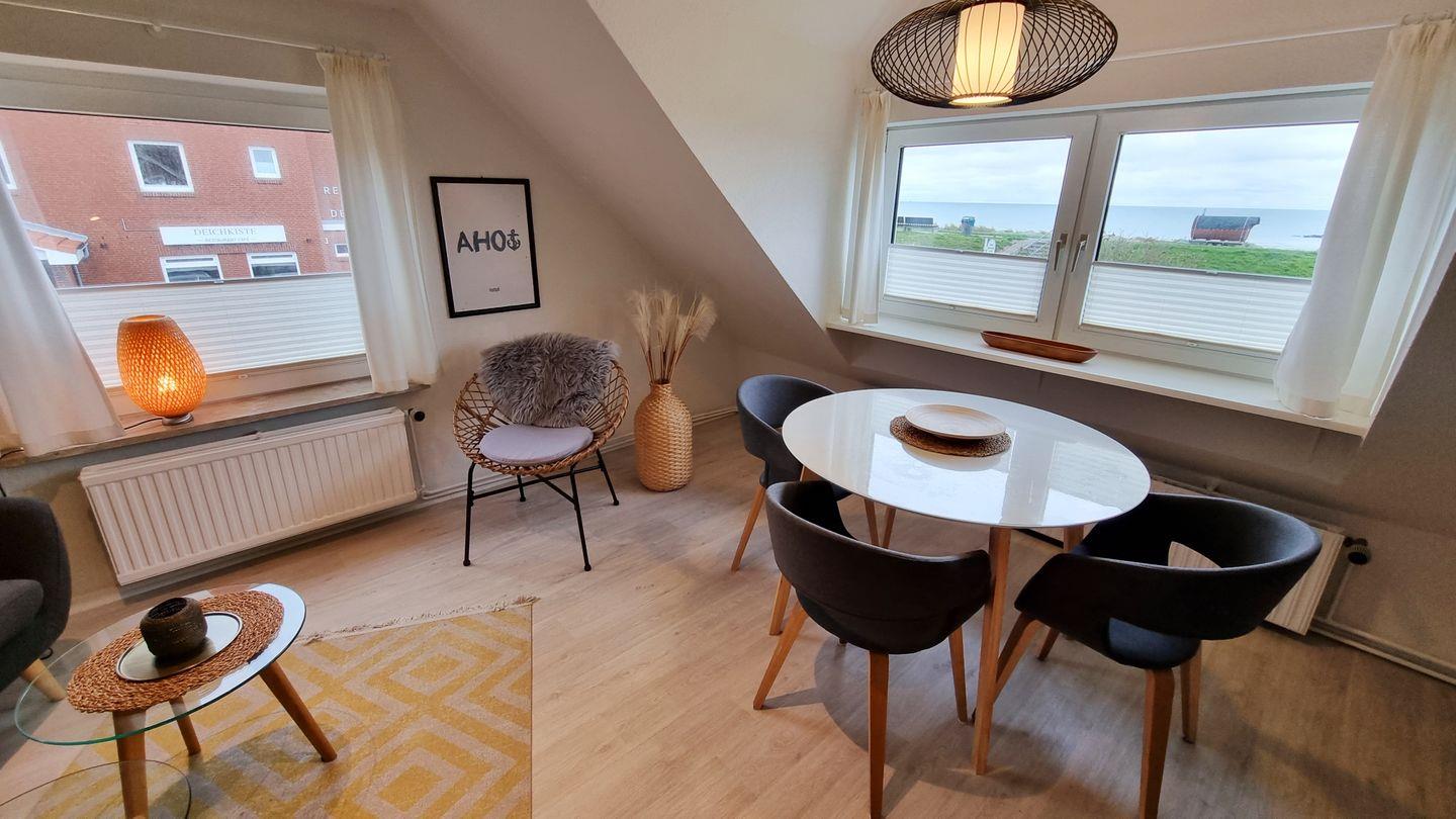 Die top renovierte Ferienwohnung „Achtern Diek 3“ liegt im Obergeschoss des Ferienhauses „Achtern Diek“, nur 50 m von der Ostsee entfernt. Für 3 Personen bietet sie 2 Schlafzimmer mit Meerblick, 2 Duschbäder, moderne Küche und Wohn-/Essbereich. Restaurants, Einkauf und Freizeitangebote sind fußläufig erreichbar.