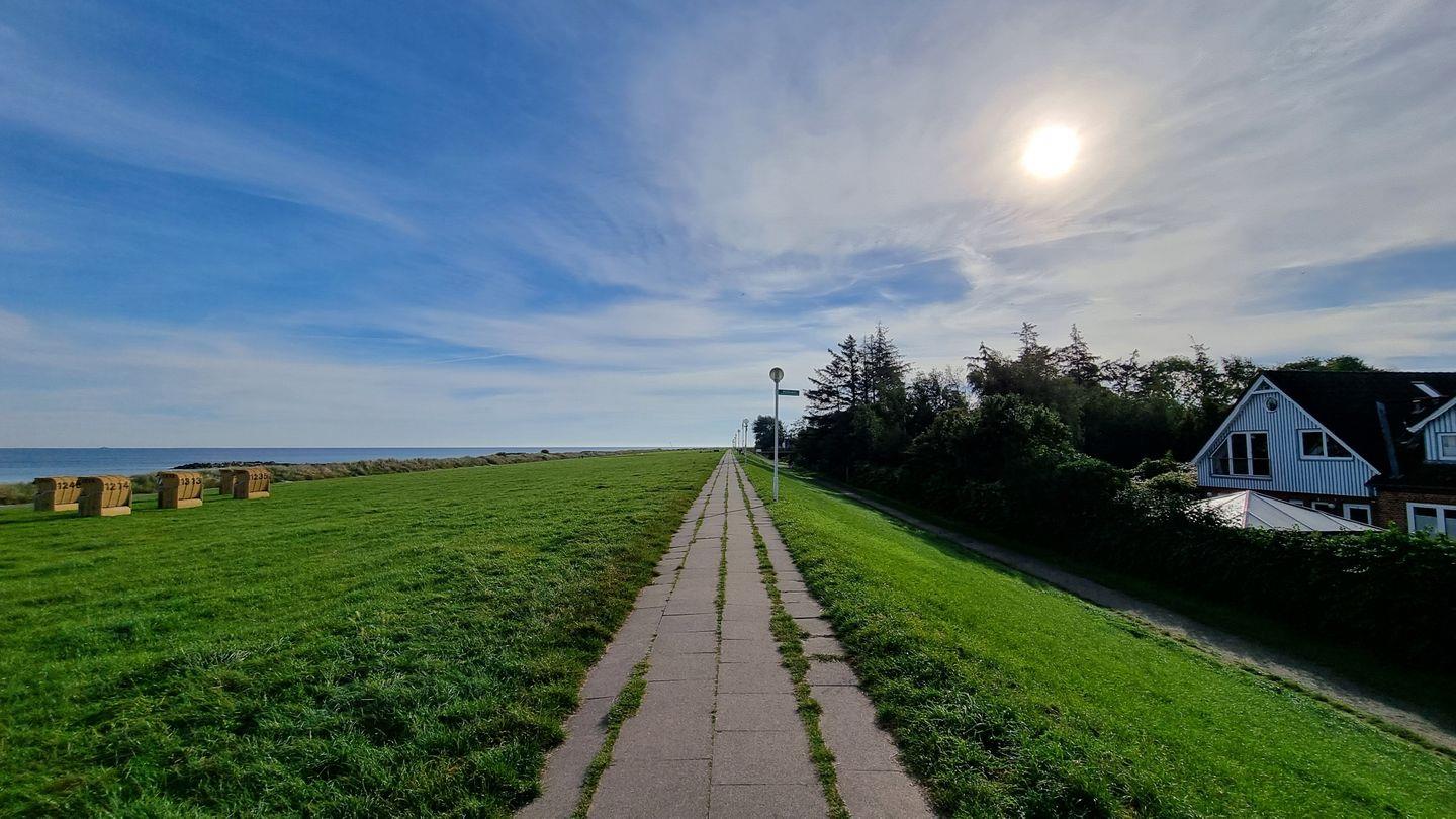 Moderne Ferienwohnung Achtern Diek 3 mit Meerblick, 50 m von der Ostsee, zwei Bädern und Garten.