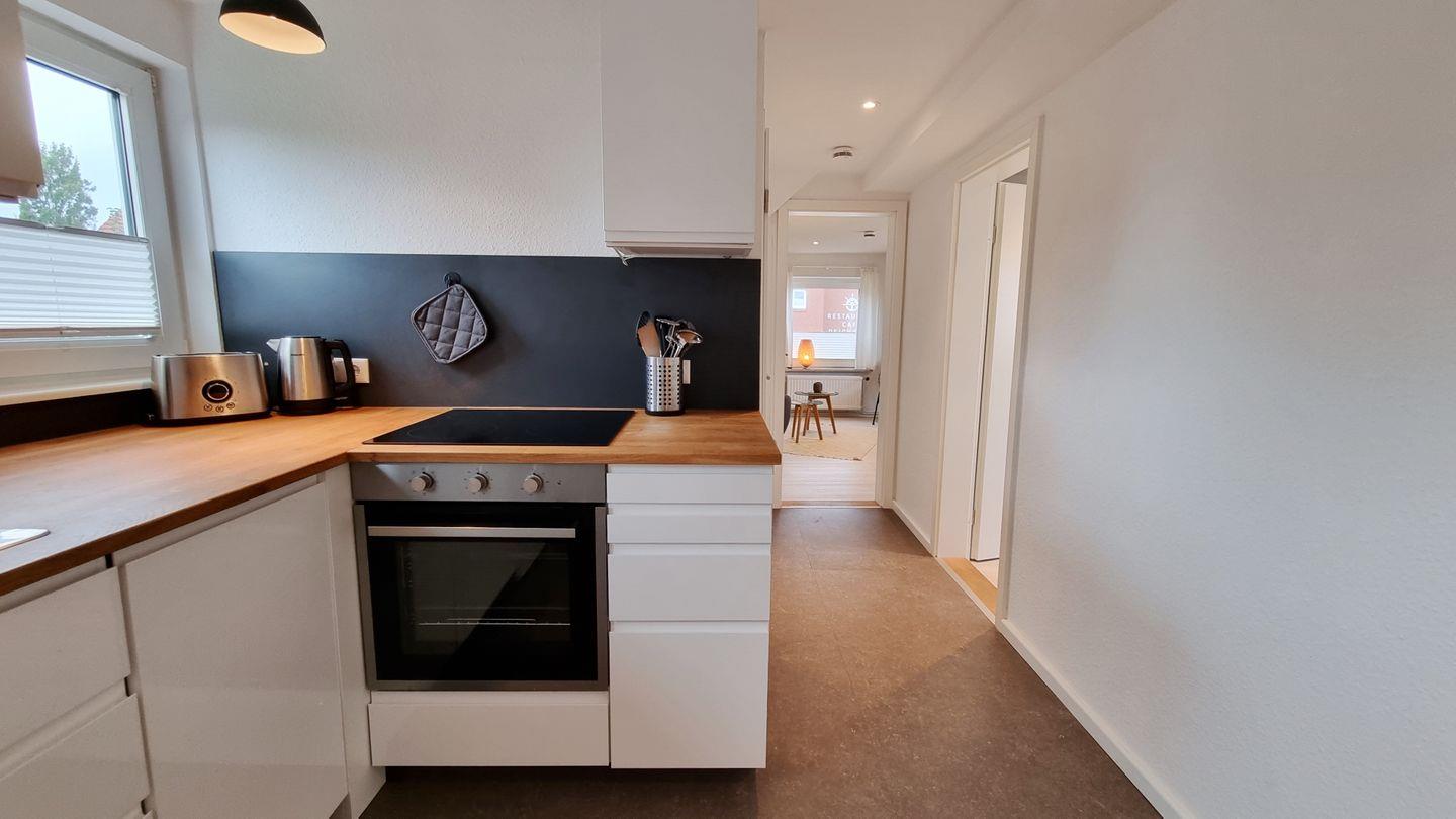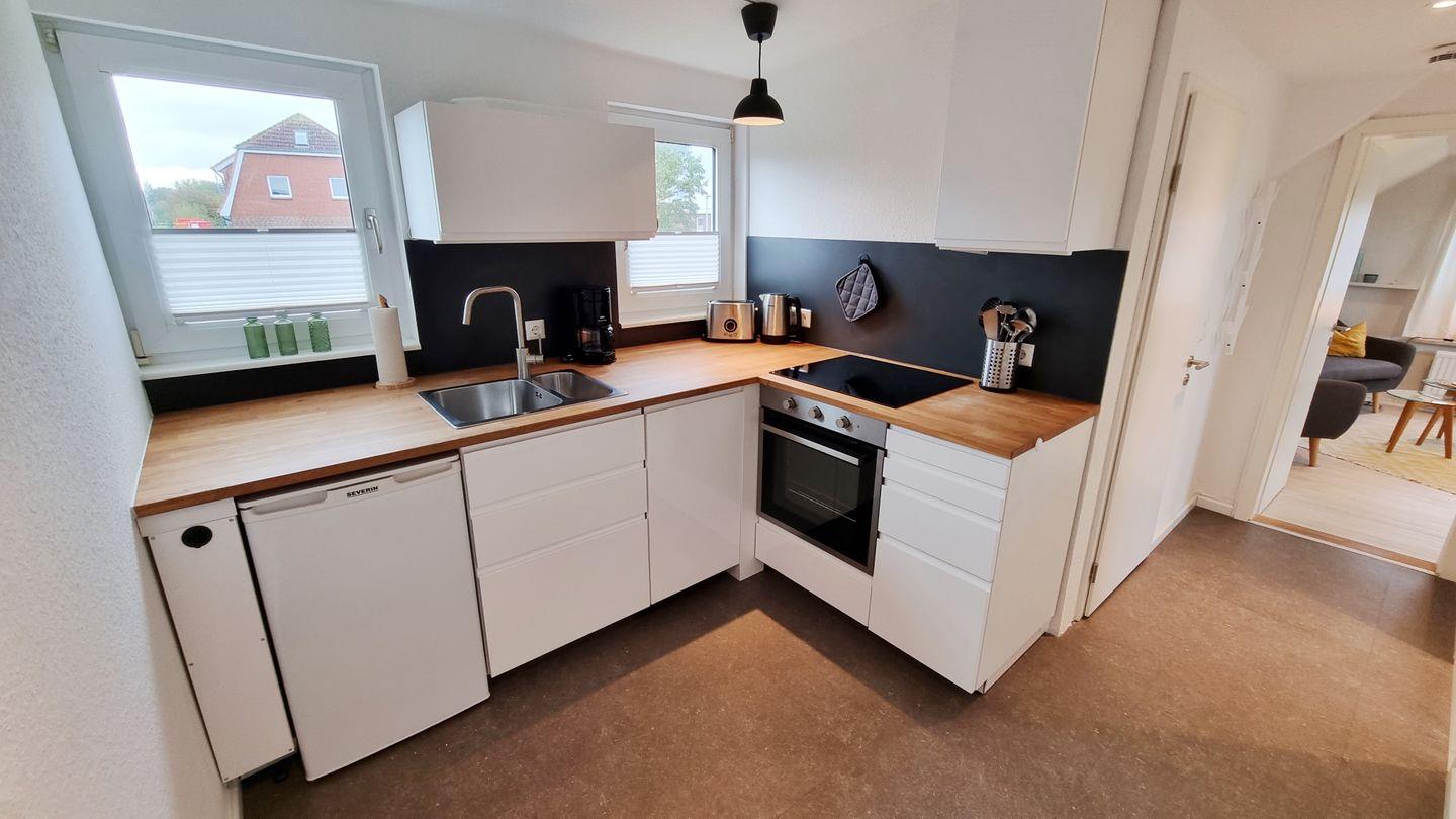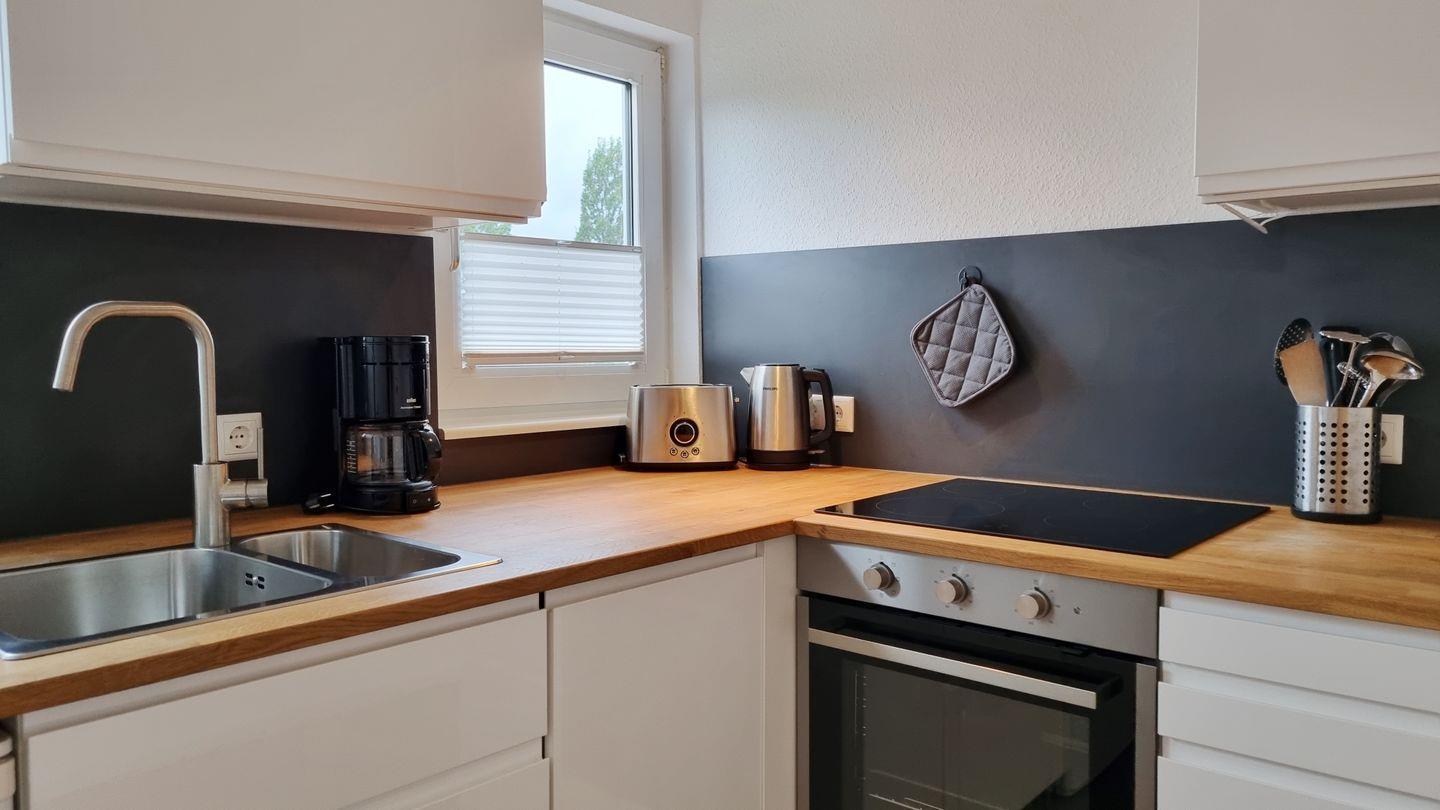 offene Küche: Cerankochfeld / Backofen / Toaster / Filterkaffeemaschine / Wasserkocher / Kühlschrank mit Gefrierfach