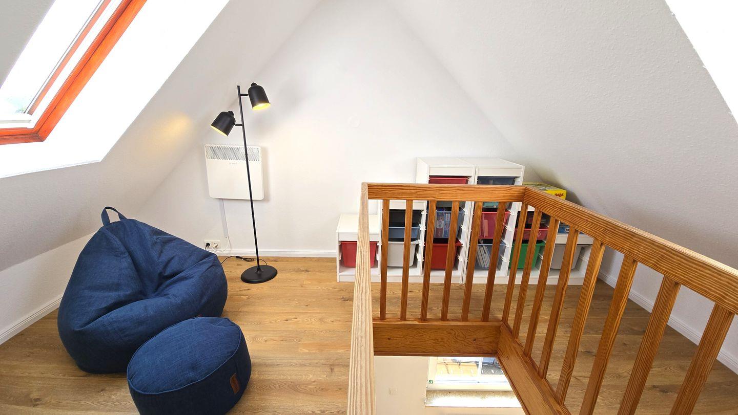 Spitzboden: Zwei Einzelbetten / zum Wohnbereich offen / Deckenhöhe eher niedrig