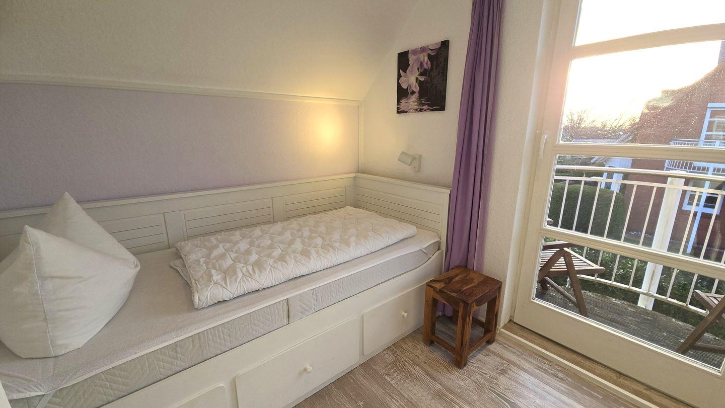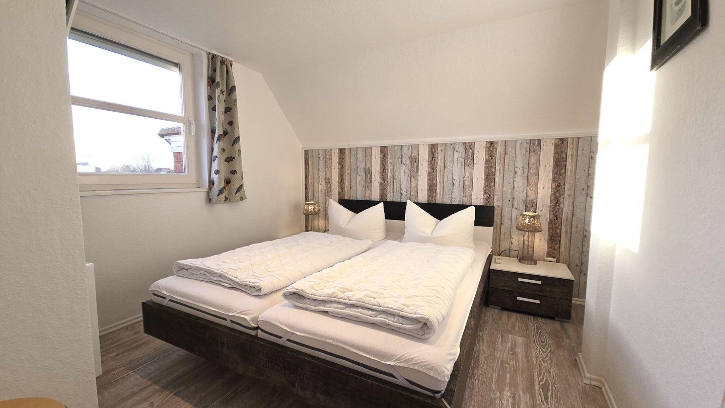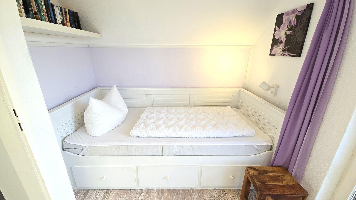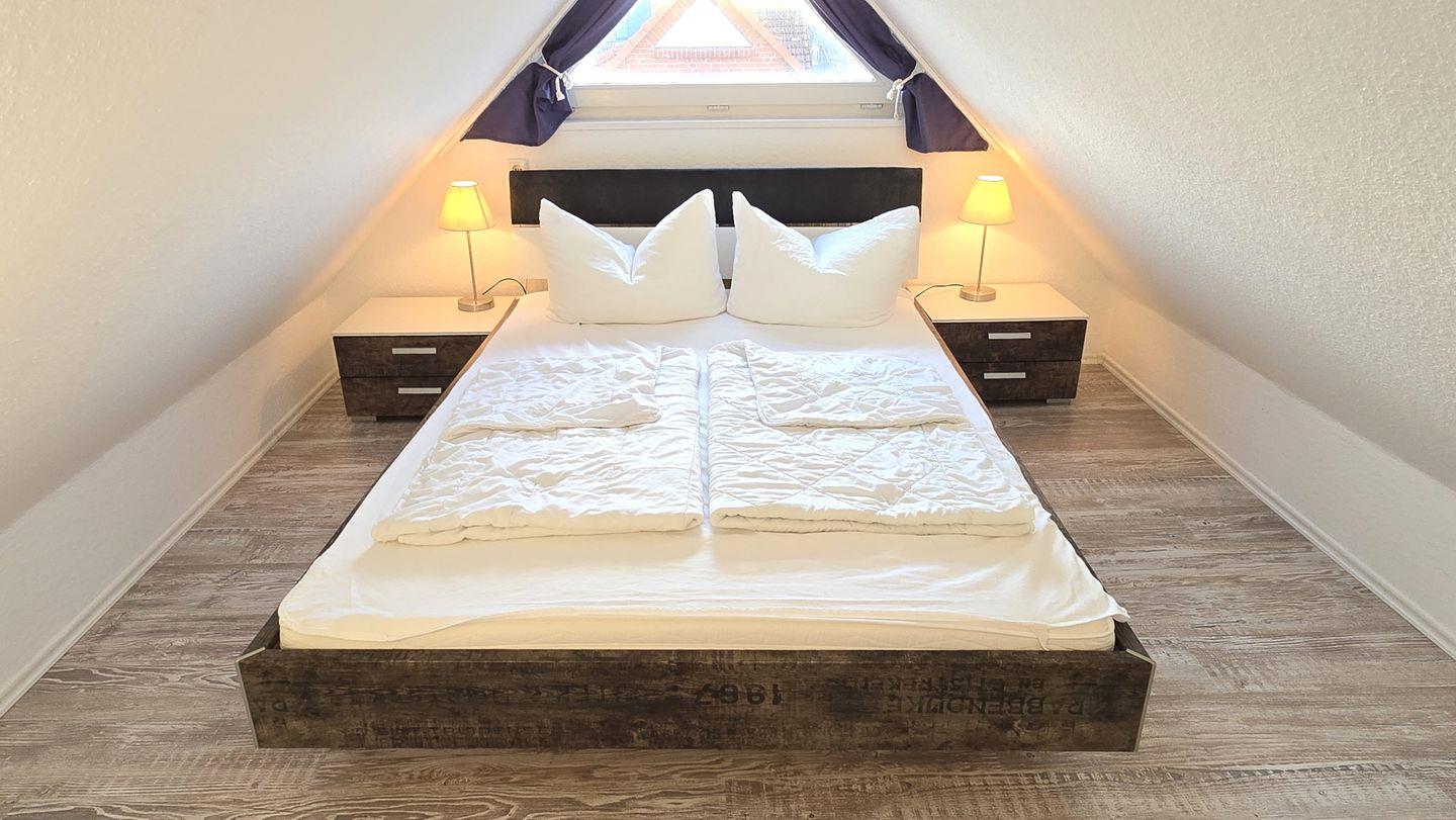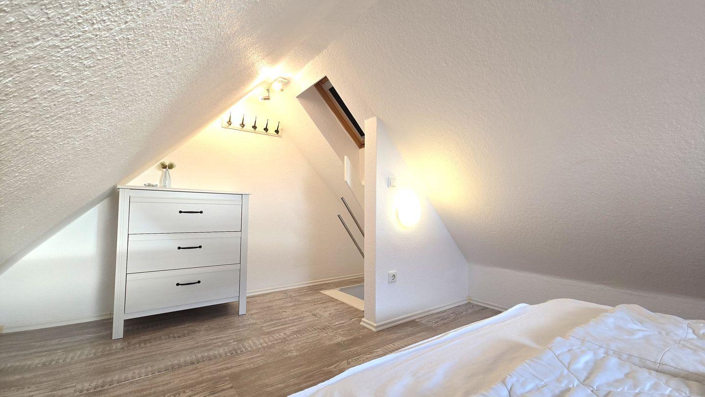 Schlafzimmer III (in der Galerie, über eine steilere Treppe erreichbar und offen zum drunterliegenden Flur): Doppelbett / Kommode