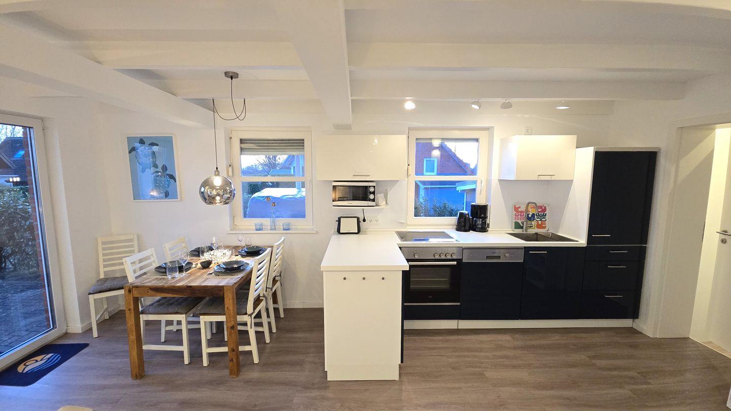 Küche: große Küche / Cerankochfeld / Backofen / Geschirrspüler / Kaffeemaschine / Wasserkocher / Mikrowelle / Kühlschrank / Gefrierschrank / Toaster / Esstisch mit 4 Stühlen