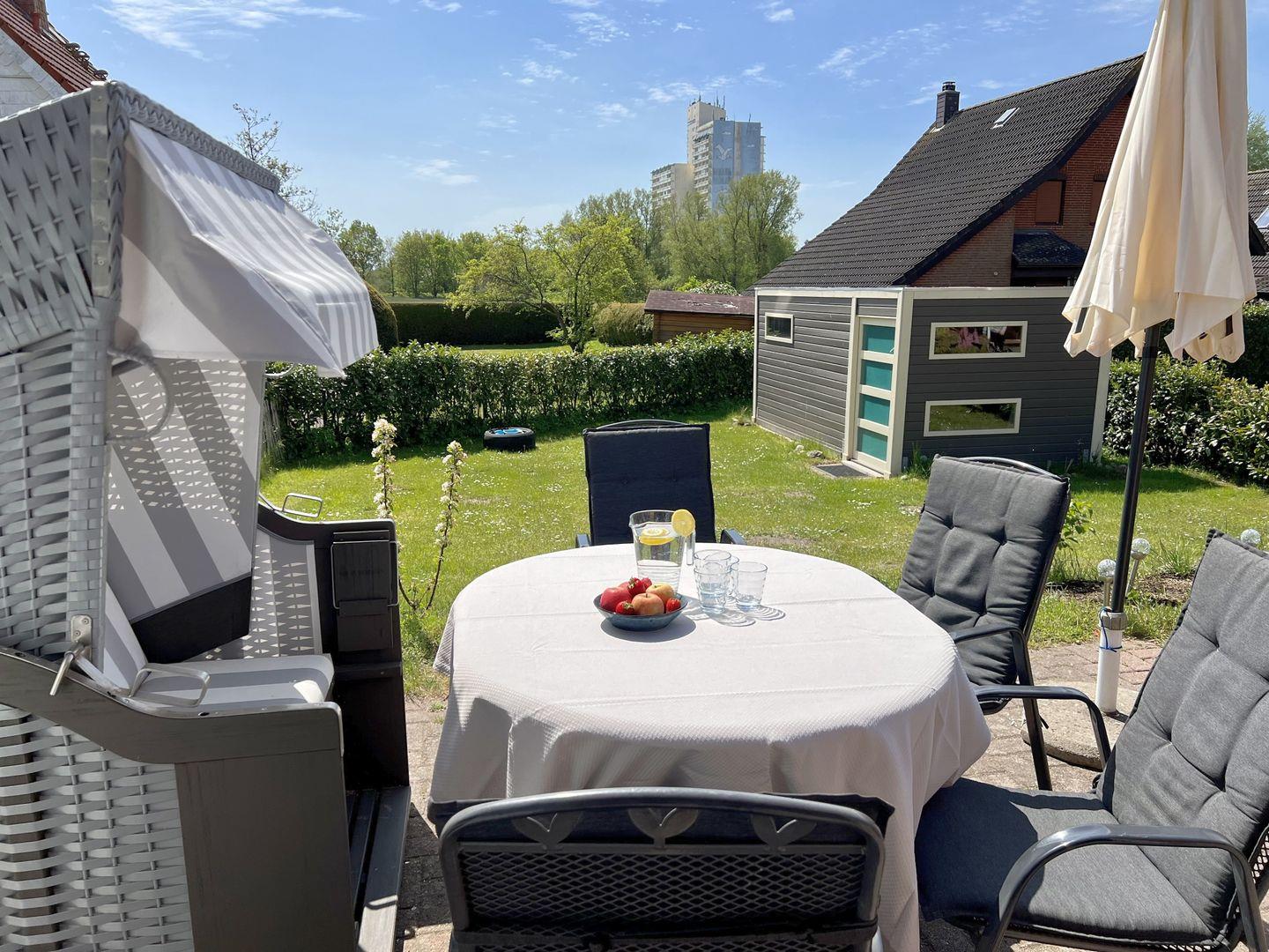 Garten: Terrasse / Strandkorb am Haus / Tisch / 5 Stühle / offene Rasenfläche / Holzkohlegrill / Sonnenschirm