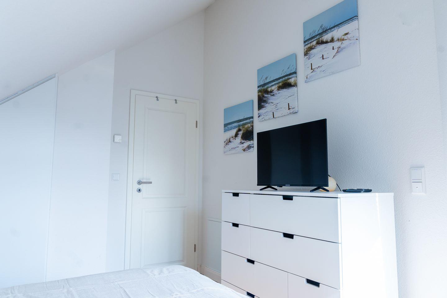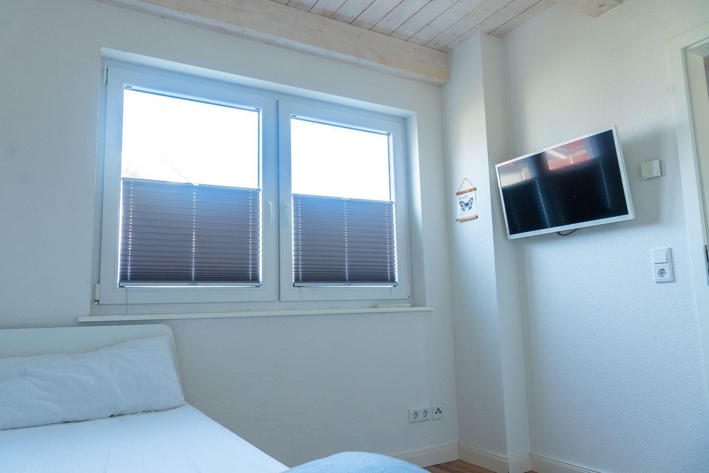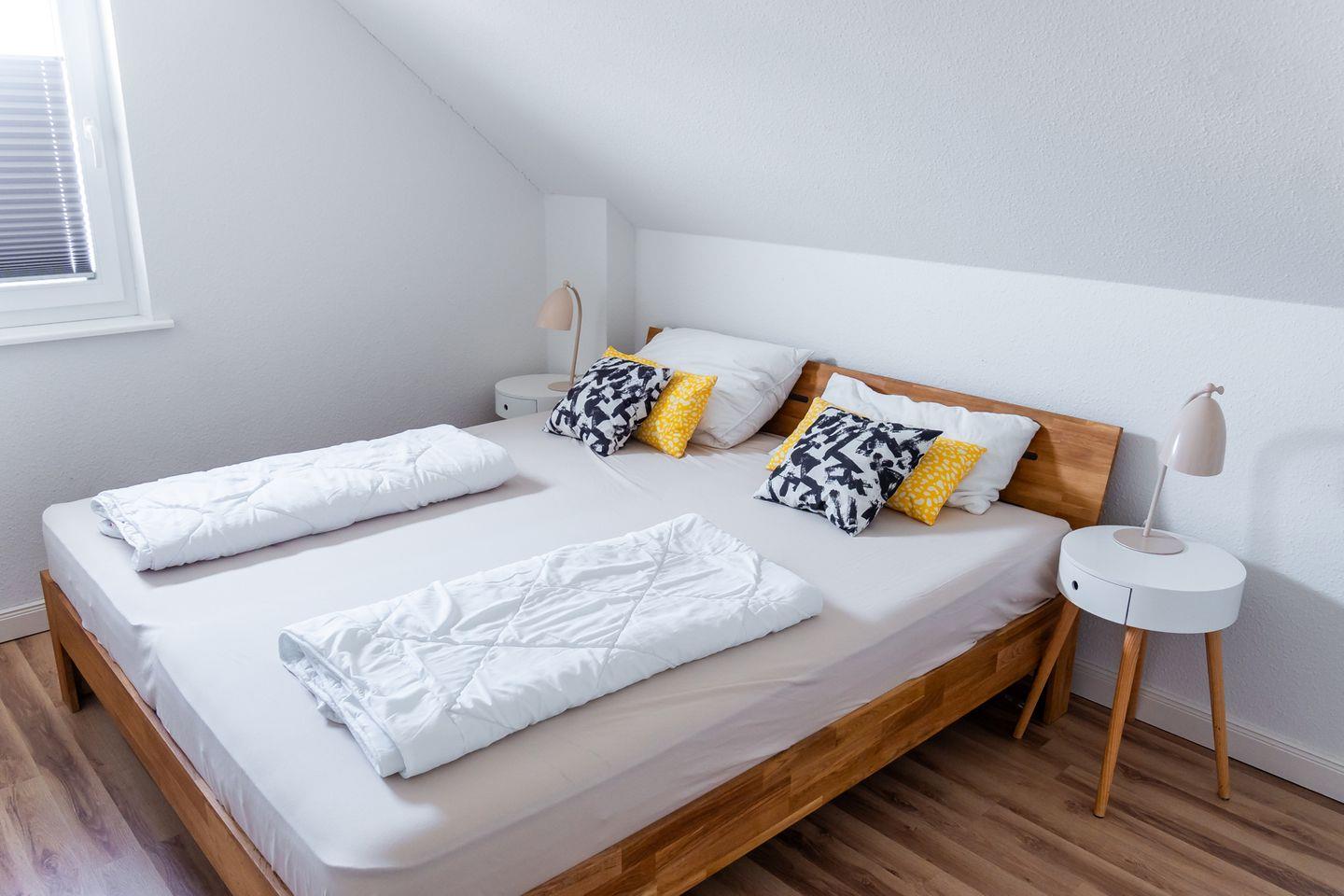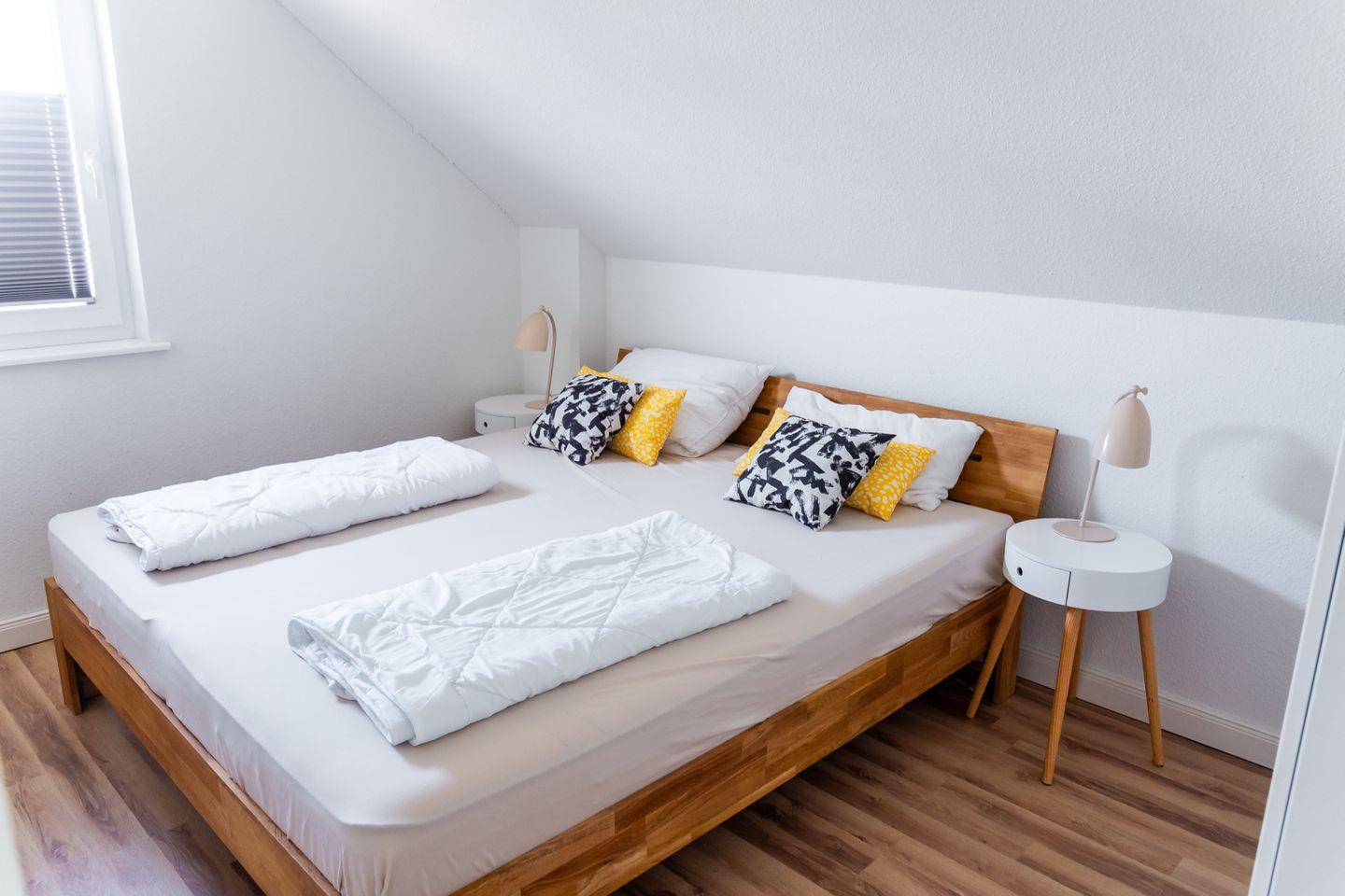 Das Haus verfügt über vier Schlafzimmer: drei im Obergeschoss und eines im Erdgeschoss, so dass dort auch mobil eingeschränkte Personen eine Schlafstatt finden. Jedes der Schlafzimmer ist liebevoll eingerichtet und die Betten sind mit hochwertigen Hotelwendematratzen (eine weichere und eine härtere Seite) ausgestattet, so dass jeder nach seinem Belieben die für sich angenehmere Seite auswählen kann. An den Fenstern der Schlafzimmer sind Verdunklungsplissees angebracht, so dass auch während der langen Sommertage ein entspanntes Ausschlafen gewährleistet ist. Zwei der Schlafzimmer verfügen zudem über einen Zugang zu Ihrem privaten Balkon, von dem aus Sie den herrlichen Blick ins Grüne haben und so manche Sonnenstunden genießen können.