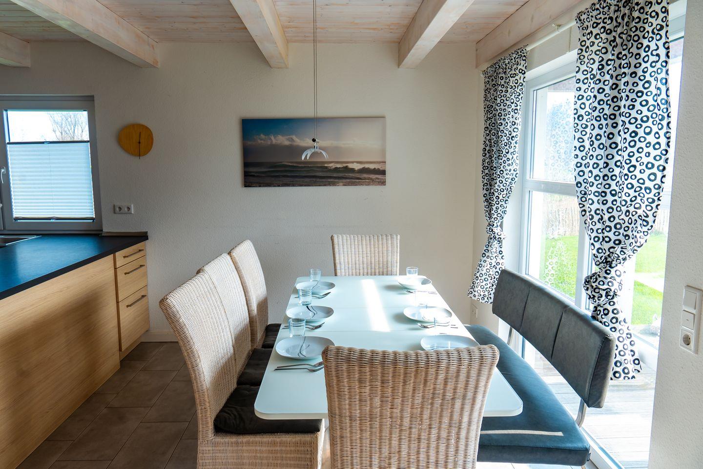 Der Wohn-Essbereich des Ferienhauses ist geschmackvoll eingerichtet und luxuriös ausgestattet. Die großen Fenster sorgen für ein lichtdurchflutetes Inneres und ermöglichen Ihnen einen spektakulären Blick in die Natur.