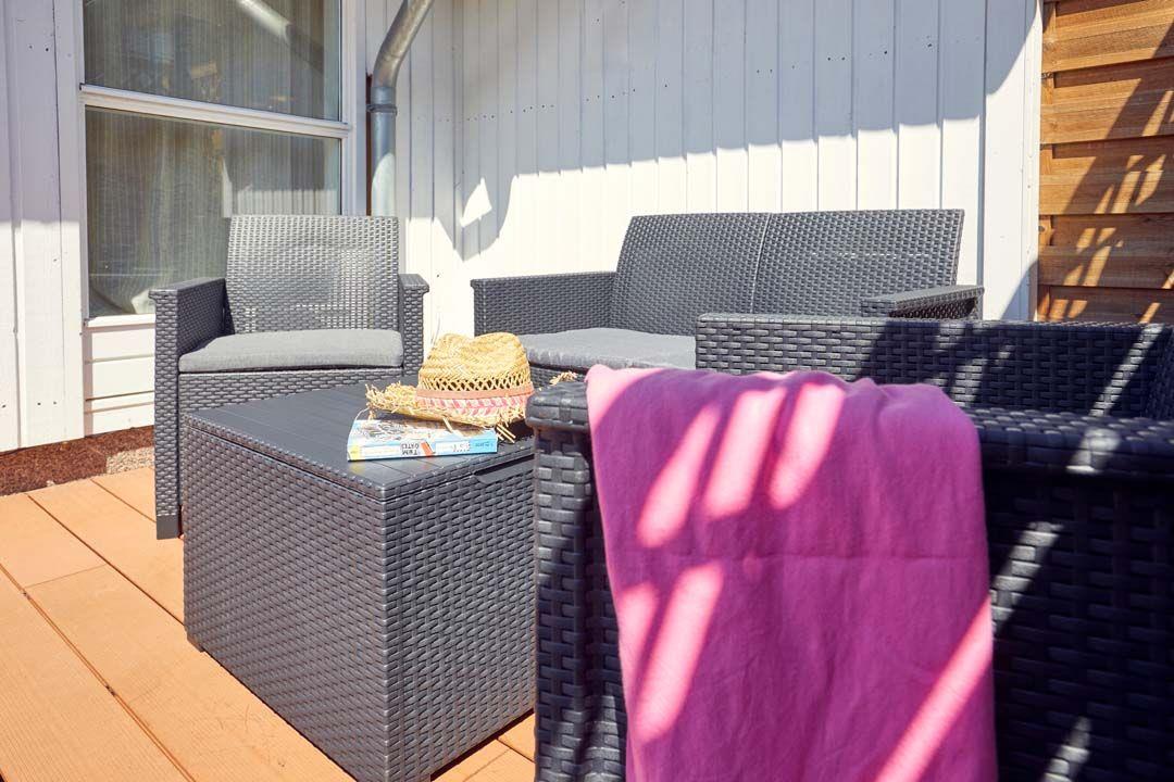 Der Wohnbereich des Ferienhauses bietet ein bequemes Sofa und eine große Fensterfront, die viel natürliches Licht hereinlässt und einen herrlichen Ausblick auf die Umgebung bietet. Entspannen Sie sich hier beim Lesen, Schauen Sie sich einen Film auf dem Flachbildfernseher an oder nutzen Sie das vorhandene DSL/WLAN-Internet, um mit Ihren Lieben in Kontakt zu bleiben.