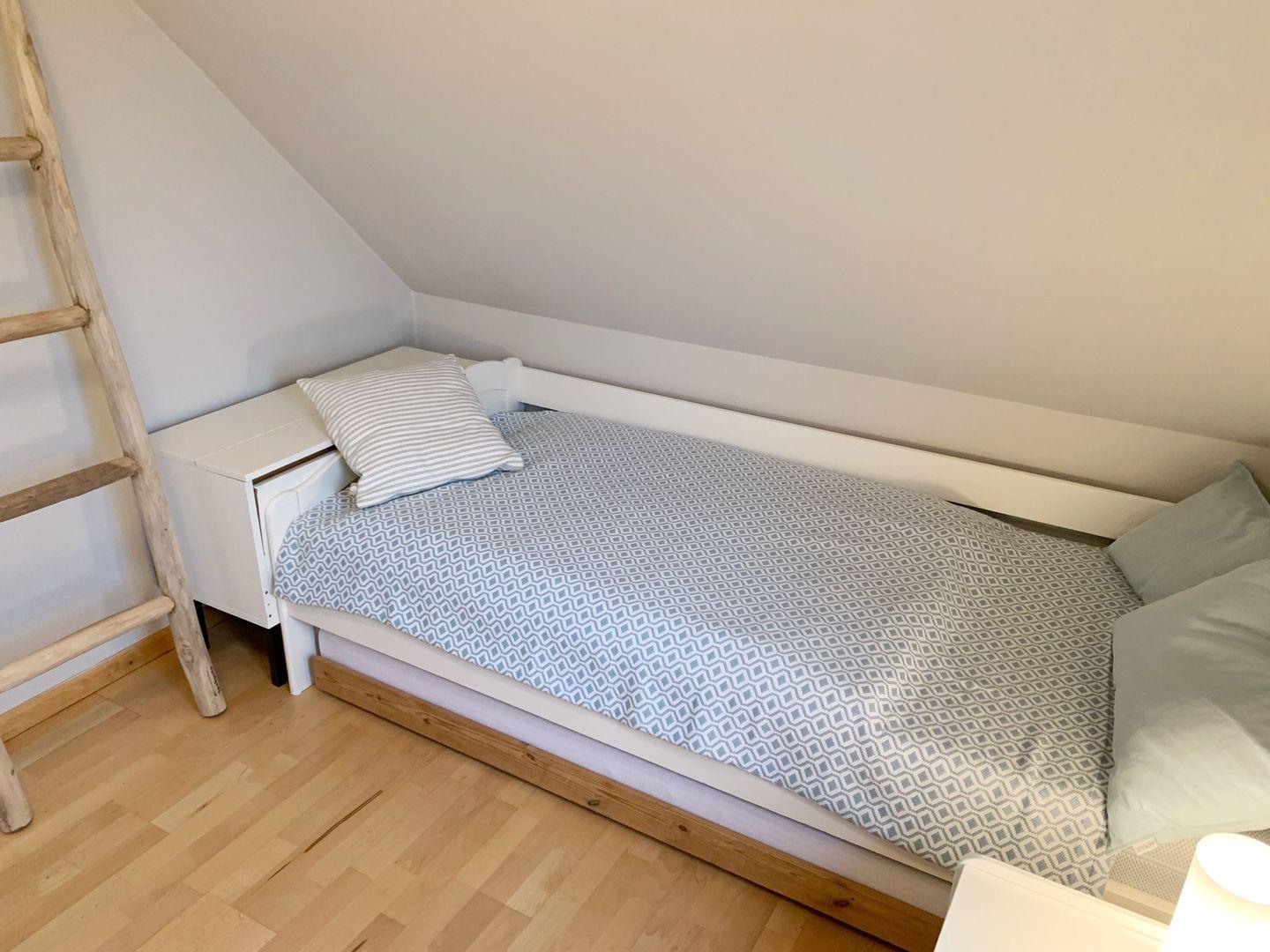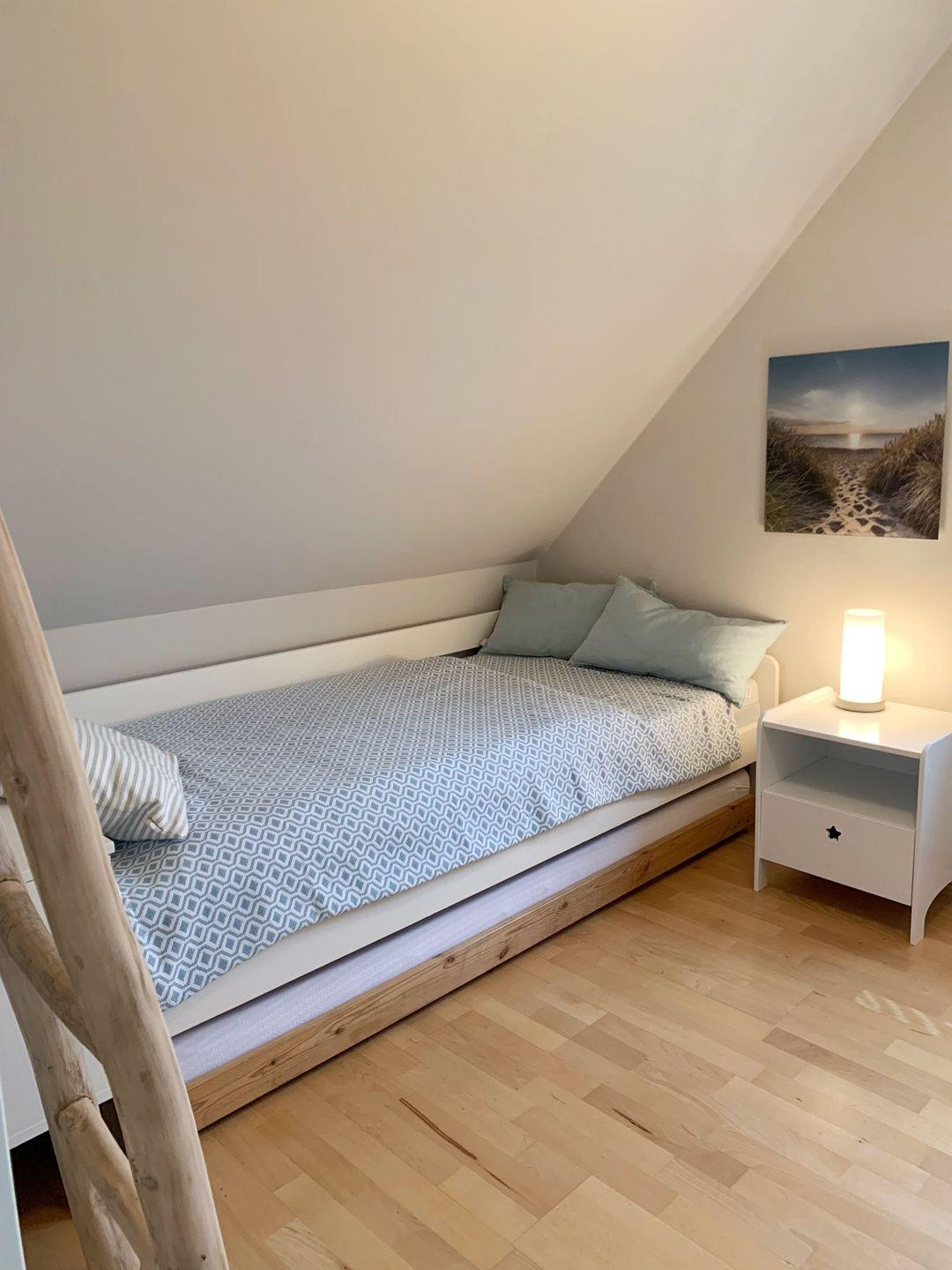 Schlafzimmer 3 (Obergeschoss): Einzelbett mit Auszugsmöglichkeit einer weiteren Matratze: 0,90 x 2 m, Kleiderschank, Vorhänge + Innenjalousie, Leselampe