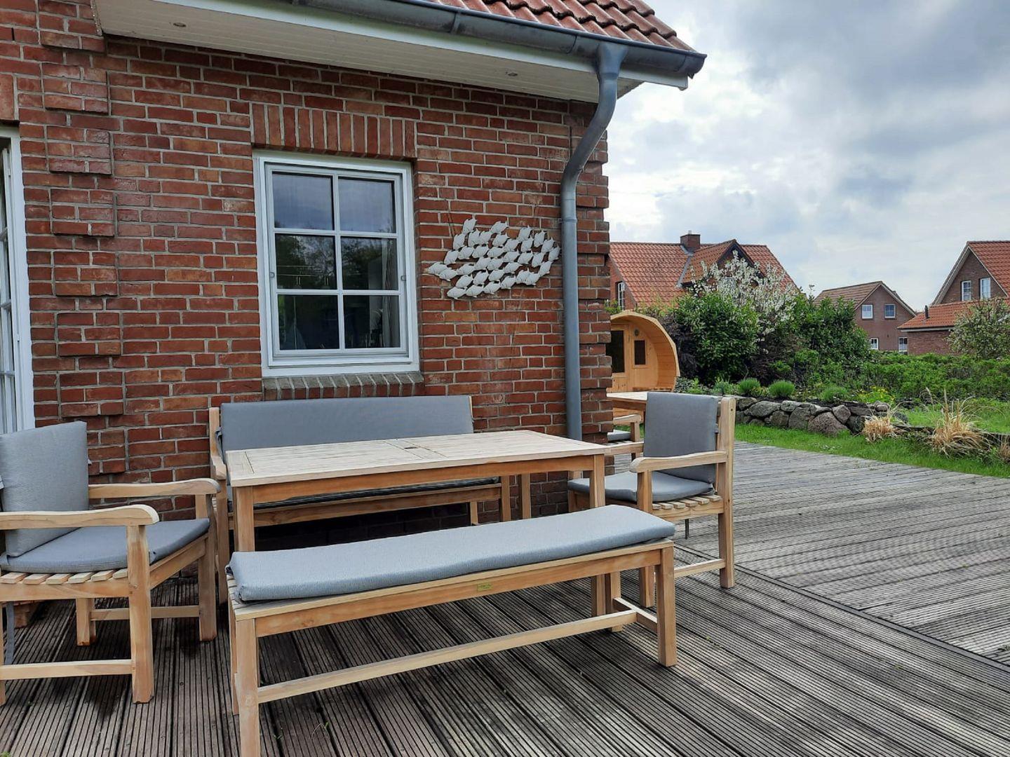 Die Terrassen haben eine Süd- und Westausrichtung. Auf beiden Seiten befinden sich Sitzgarnituren mit gemütlichen Polstern, Kissen und Decken, zwei Strandkörbe sind auch vorhanden.