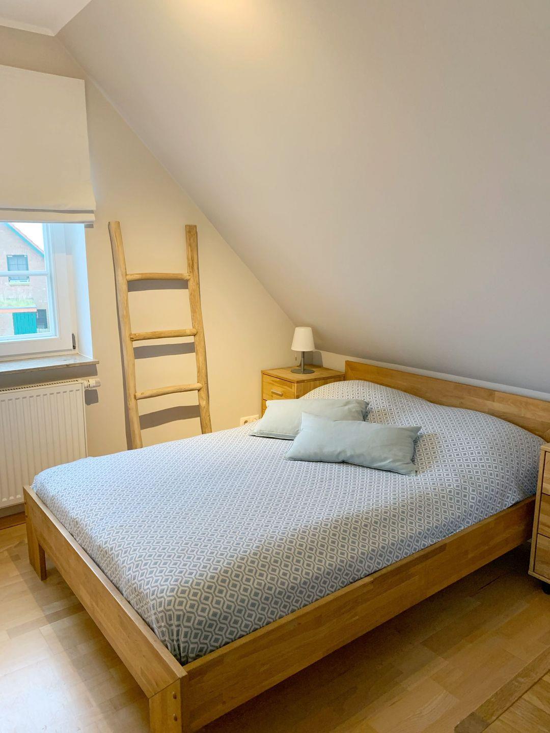 Schlafzimmer 1 (Obergeschoss): Doppelbett (1,80 x 2 m - 2 Matratzen), Kleiderschrank, Vorhänge + Innenjalousie, Kommode, Leselampe