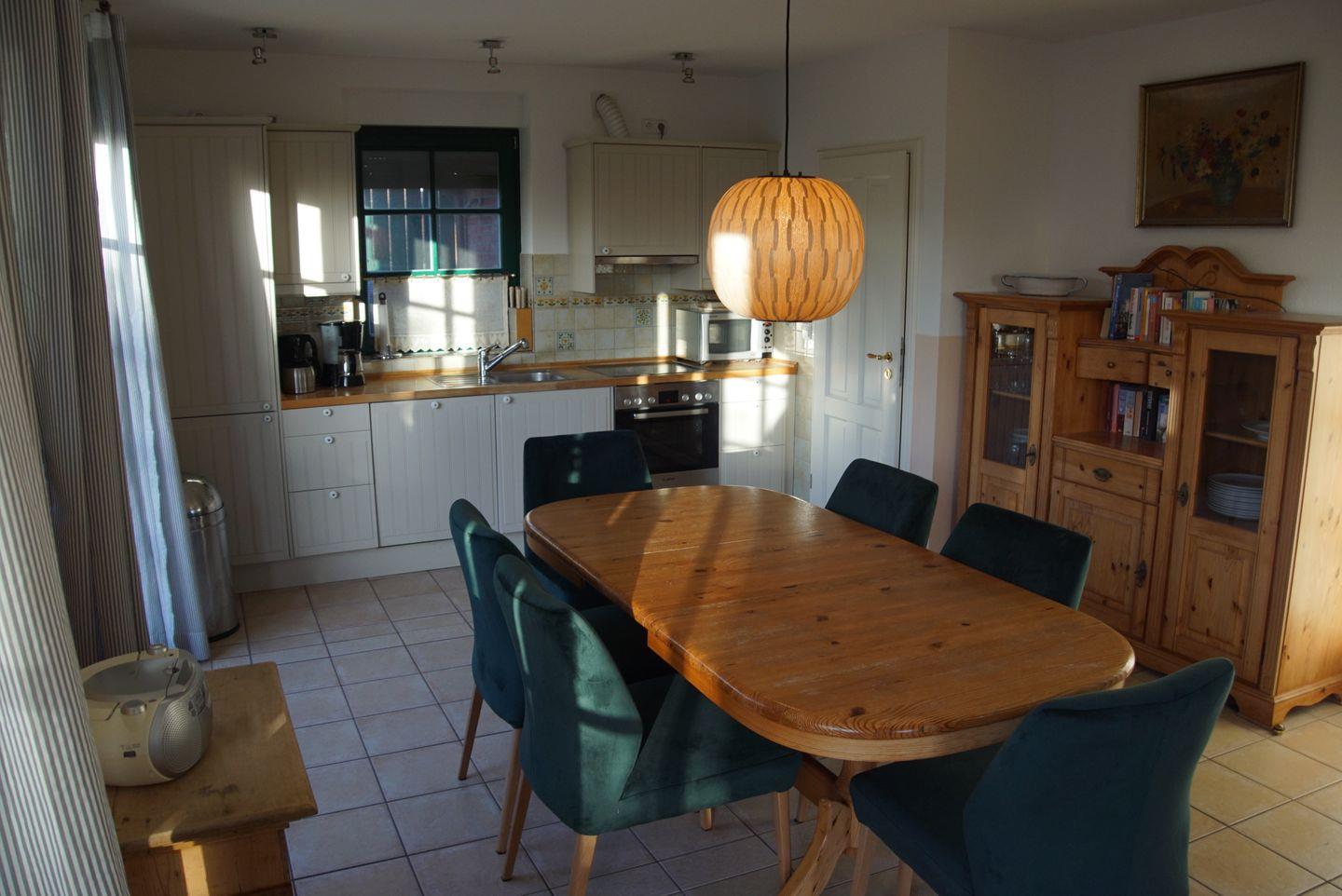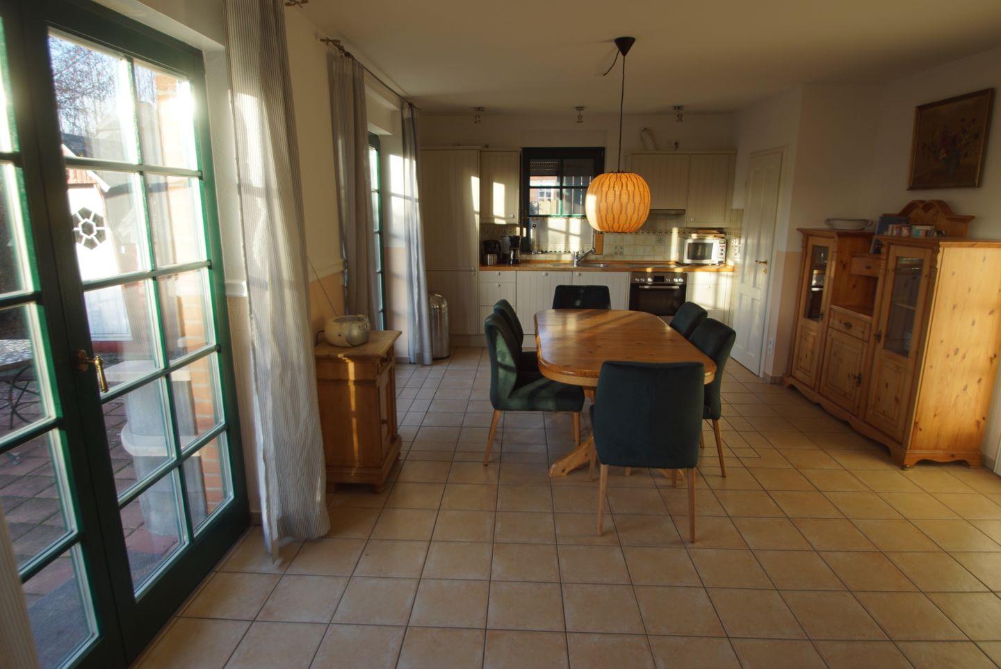 Doch nicht nur im Außenbereich erwartet Sie ein Höchstmaß an Entspannung und Erholung, auch das Innere des Hauses wird Sie begeistern. Der offene Küchen-, Ess- und Wohnbereich lädt zu gemütlichen Stunden mit der Familie oder Freunden ein. Die voll ausgestattete Küche lässt keine Wünsche offen und bietet Ihnen alle Annehmlichkeiten, die Sie für die Zubereitung köstlicher Mahlzeiten benötigen. Ob Mikrowelle, Ceran-Kochfeld, Kaffeemaschine, Geschirrspüler oder Kühlschrank mit Gefrierfach - hier finden Sie alles, was das Herz begehrt. Sogar ein Umluftbackofen, ein Wasserkocher, eine Dunstabzugshaube und ein Toaster stehen Ihnen zur Verfügung.