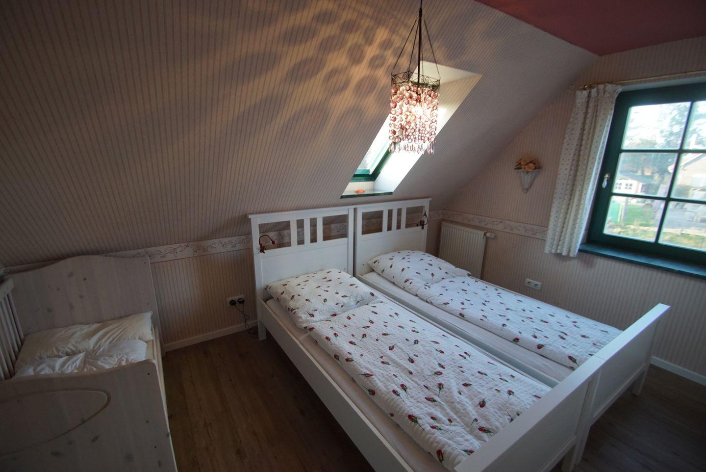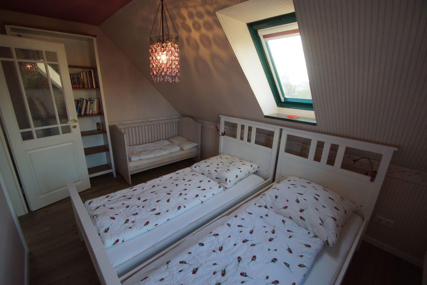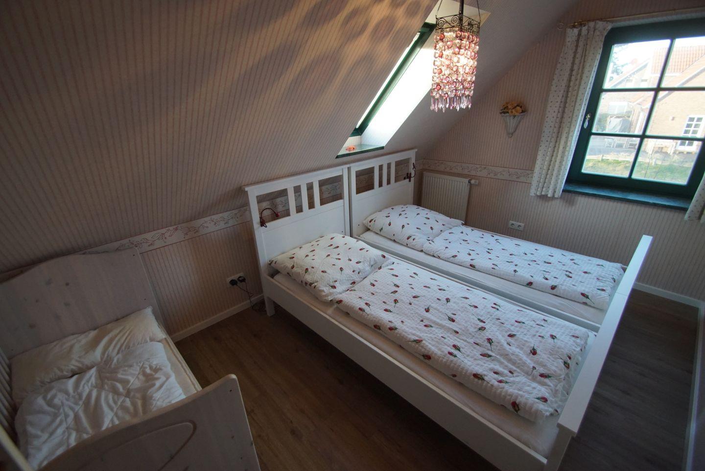 Das Ferienhaus verfügt über drei gemütliche Schlafzimmer. Im oberen Stockwerk finden Sie das erste Schlafzimmer mit einem komfortablen Doppelbett (1,80 x 2 m) ausgestattet mit zwei Matratzen. Ein geräumiger Kleiderschrank und eine Kommode bieten ausreichend Platz für Ihre Kleidung und persönlichen Gegenstände. Große Vorhänge schützen vor neugierigen Blicken und sorgen für eine angenehme Privatsphäre. Im zweiten Schlafzimmer erwarten Sie zwei Einzelbetten (je 0,90 x 2 m), ebenfalls mit einer Kommode und Vorhängen ausgestattet. Hier gibt es auch eine Auswahl an Spielsachen für die kleinen Gäste.