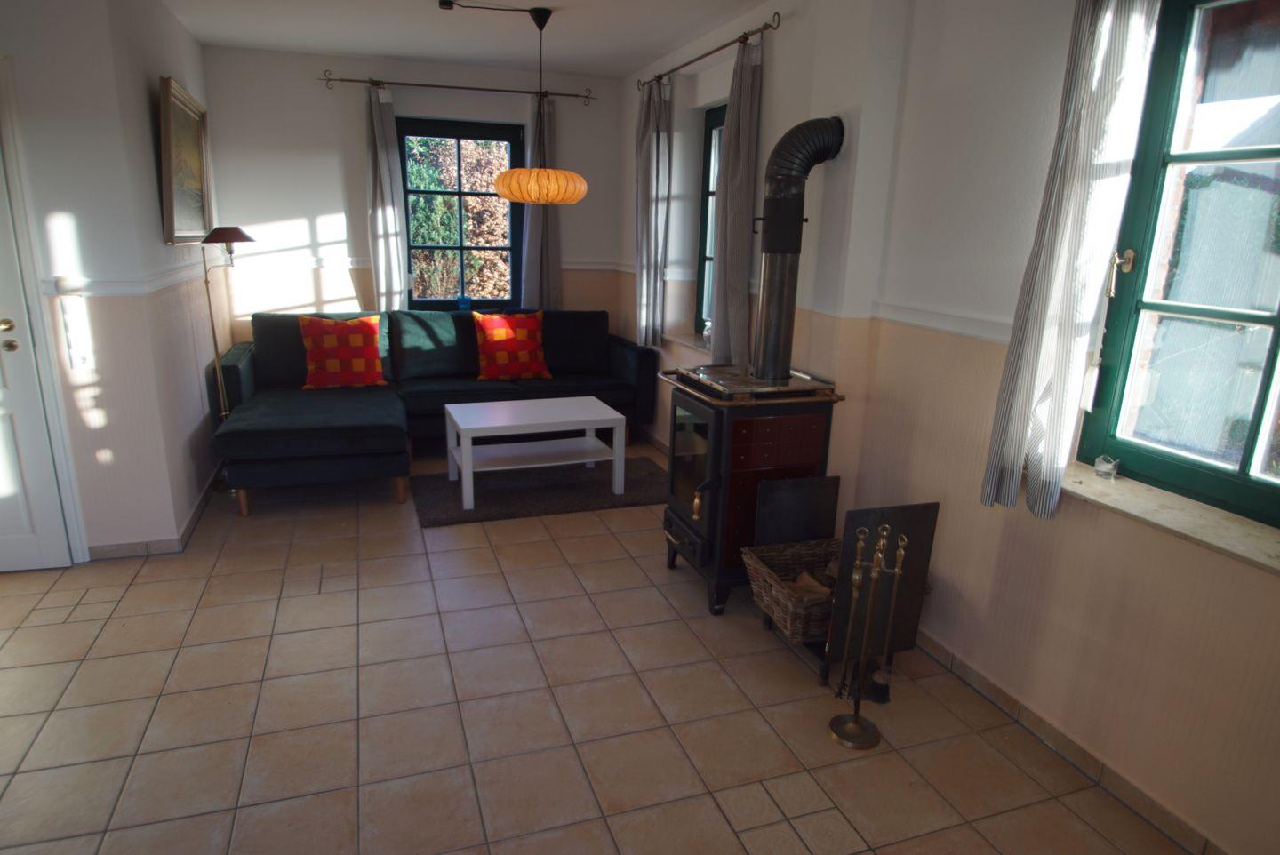 Das Wohnzimmer des Ferienhauses lädt zum Verweilen ein. Ein großes Sofa bietet ausreichend Platz für alle Gäste und vor dem Fernseher können Sie entspannte Abende verbringen. Dank der großen Fensterfront fällt viel Tageslicht in den Raum und schafft eine angenehme Atmosphäre. An kühlen Abenden sorgt der Kamin für wohlige Wärme und Gemütlichkeit.