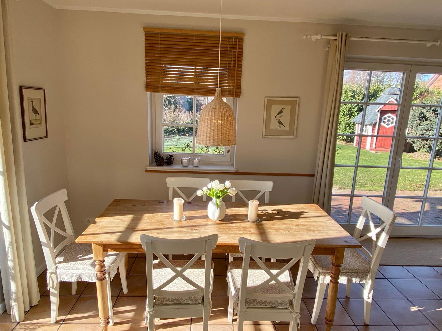 Im geräumigen Wohnzimmer erwartet Sie eine gemütliche Sitzgruppe, die zum Entspannen einlädt. Dank der großen Fensterfront gelangt viel natürliches Licht herein, und die Fußbodenheizung sorgt dafür, dass Sie sich auch an kühleren Tagen wohl fühlen. Der Essbereich mit einem Esstisch und sechs Stühlen bietet ausreichend Platz, um gemeinsame Mahlzeiten einzunehmen.