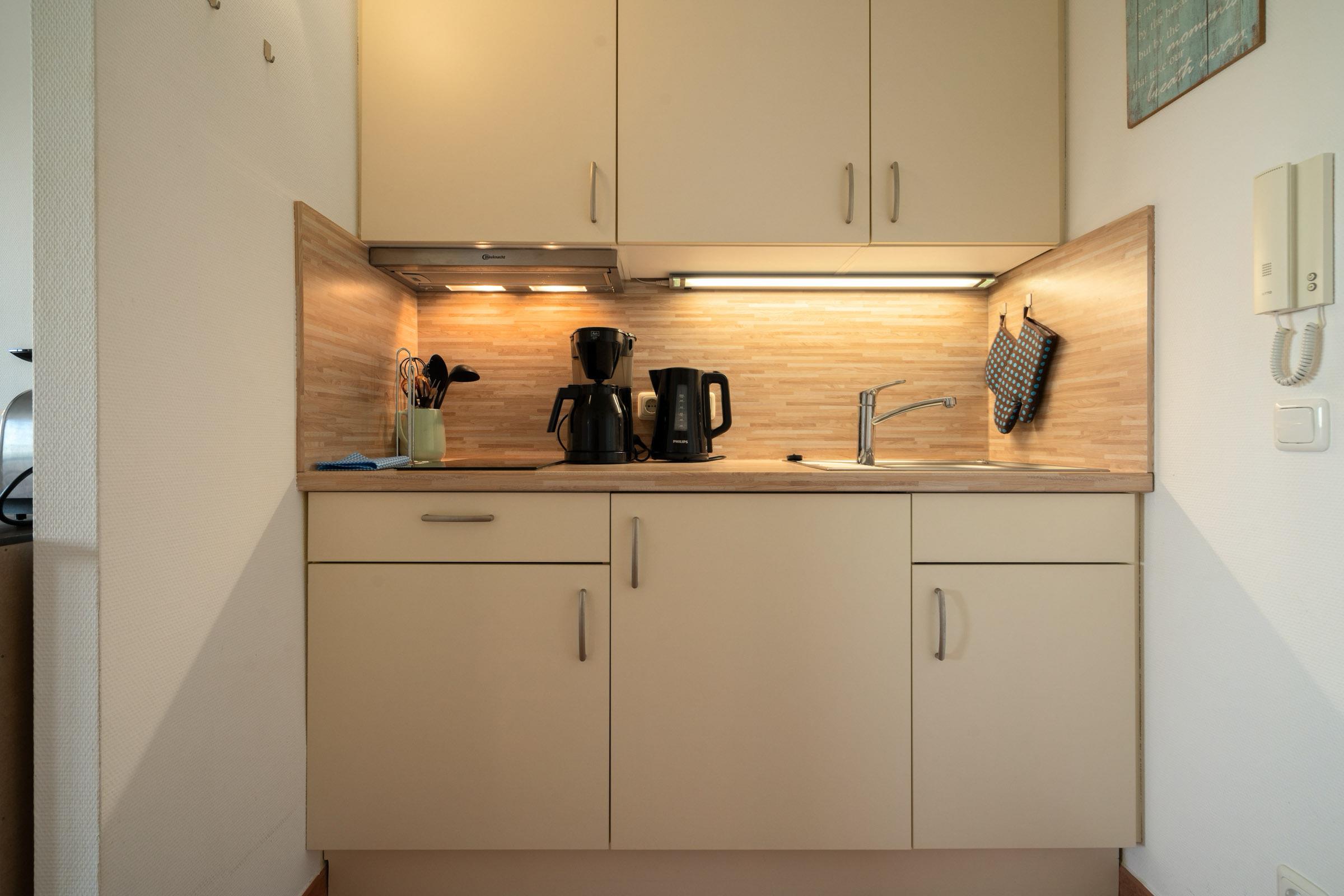 Die Wohnung bietet ein Doppelbett (180x200 cm) und Einbauschrank, gemütliche Sitzplätze zum Lesen, separate Sitzplätze zum Essen, einen Flachbildschirm-TV mit Apple TV, iPhone Ladekabel und Hifi-Anlage. Das Badezimmer verfügt über eine Dusche mit WC. Die Küchenzeile ist ausgestattet mit einer 2-Platten-Herdplatte, für Frühstück stehen sowohl Toaster als auch Kaffeemaschine/ Wasserkocher bereit. Ihre Abende lassen sich gut auf dem eigenen Balkon ausklingen.