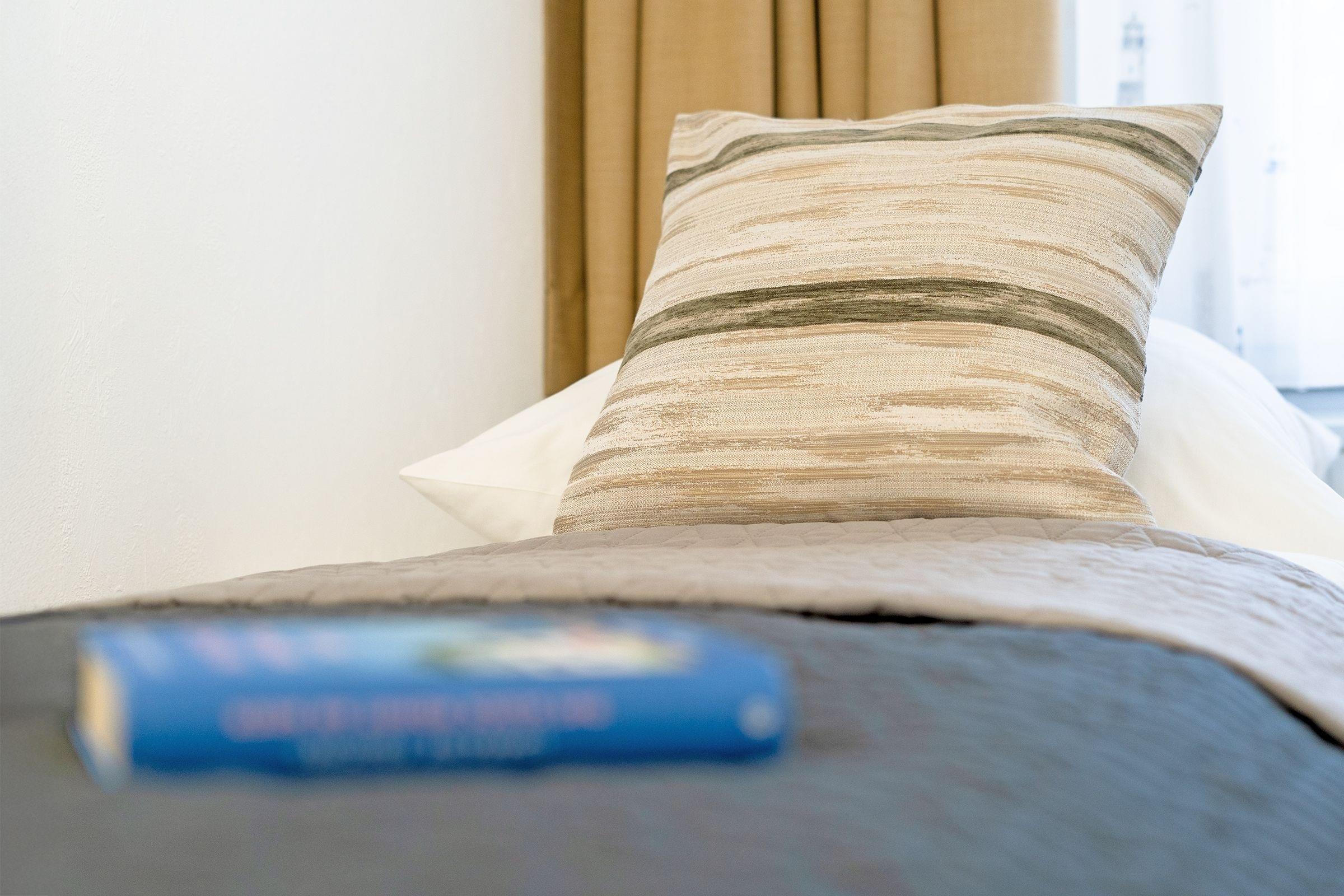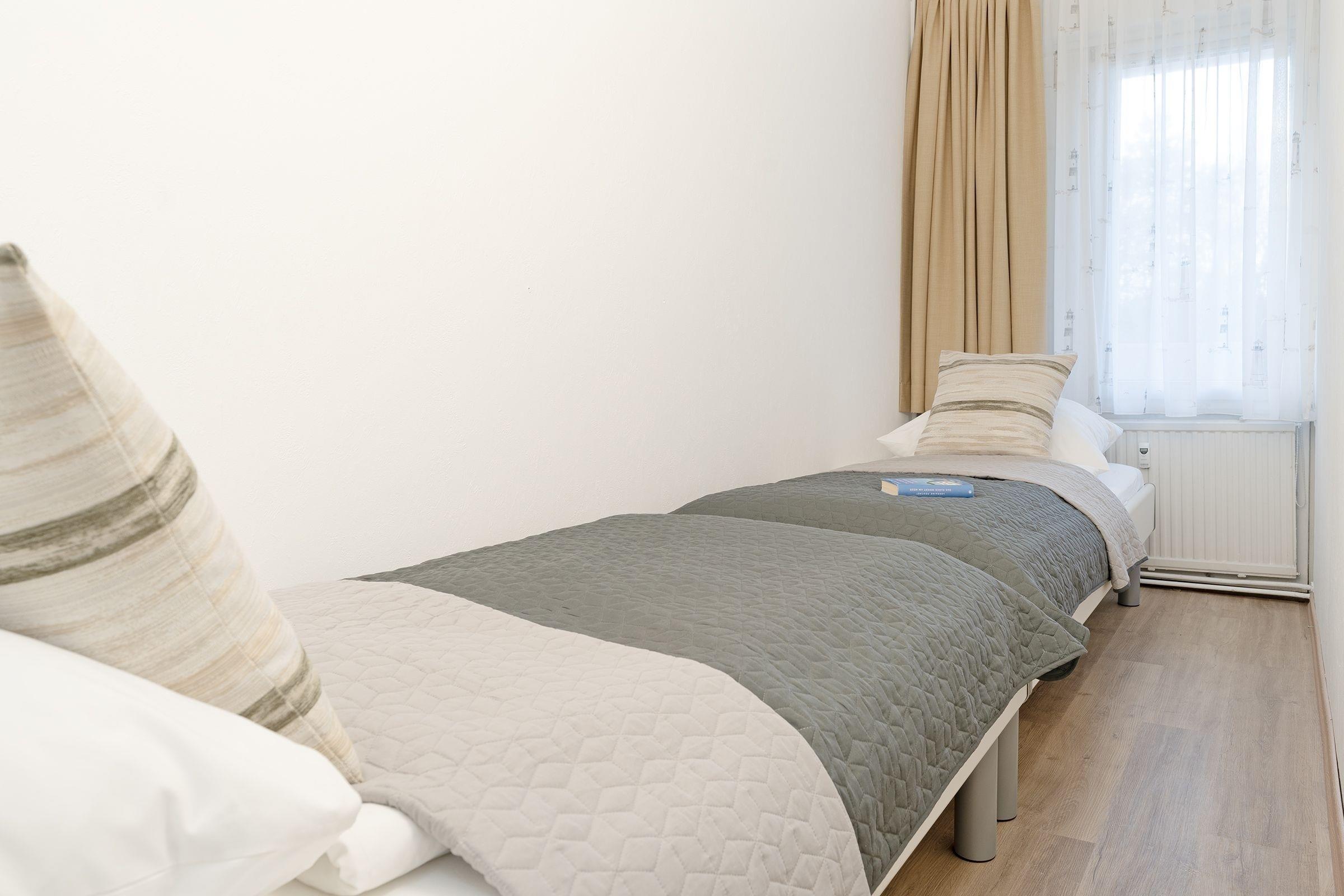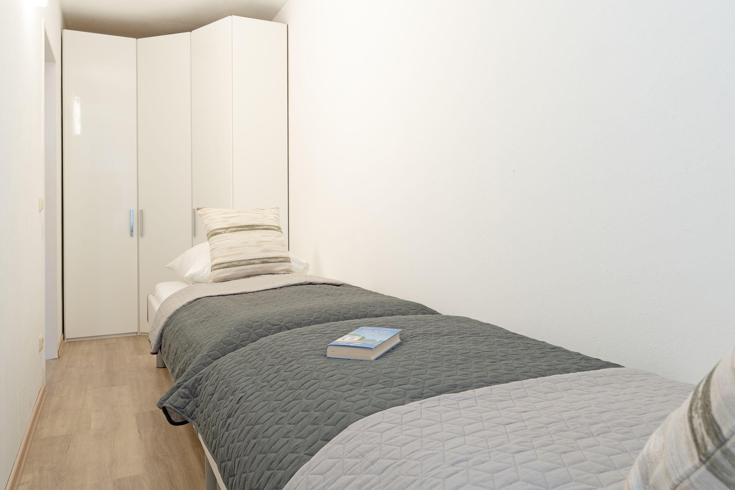 Schlafzimmer: 2 Einzelbetten (2x 90x200 cm), Kleiderschrank, Verdunkelung: Gardinen, kein Platz für ein Babybett vorhanden