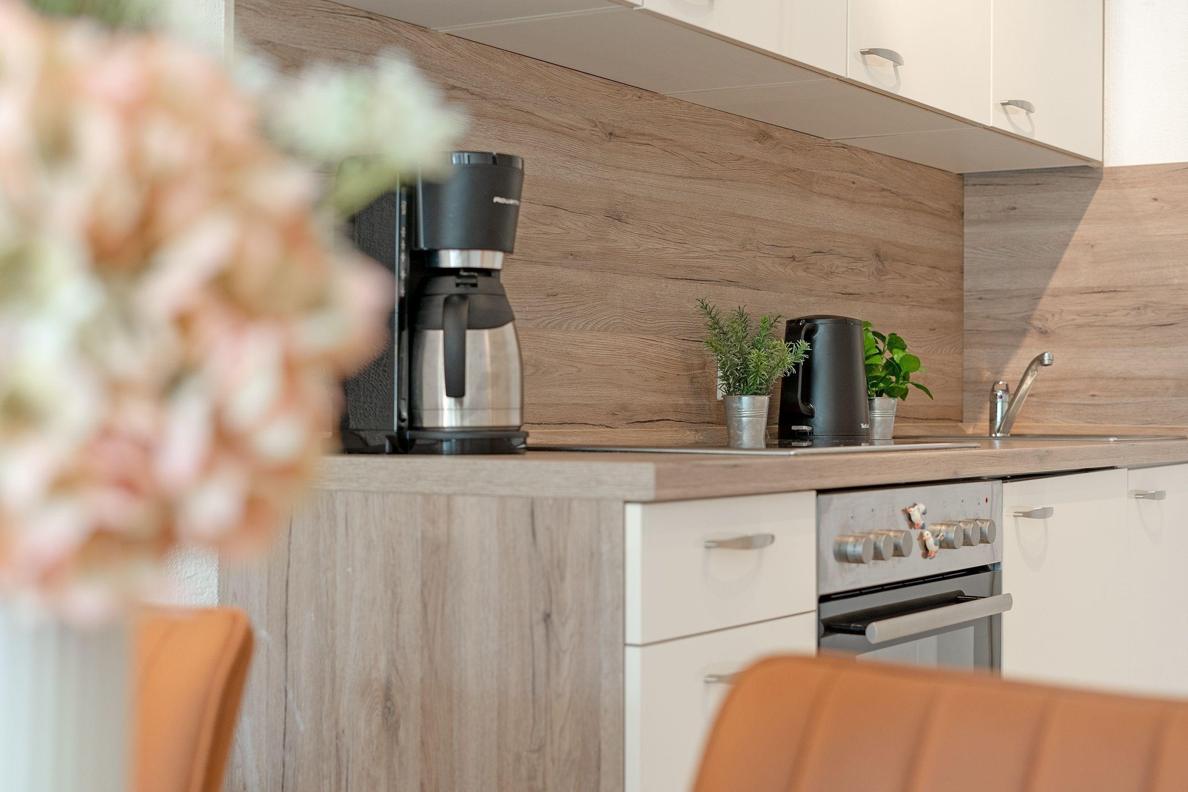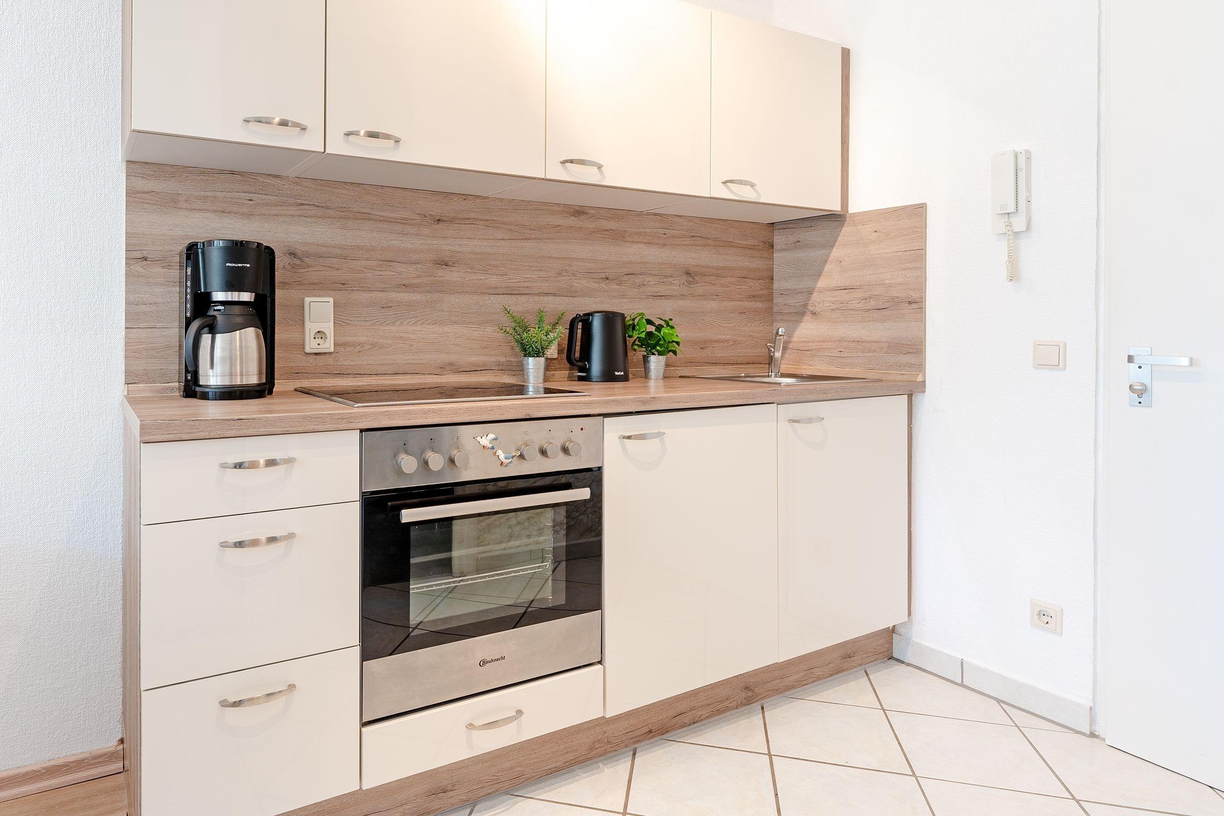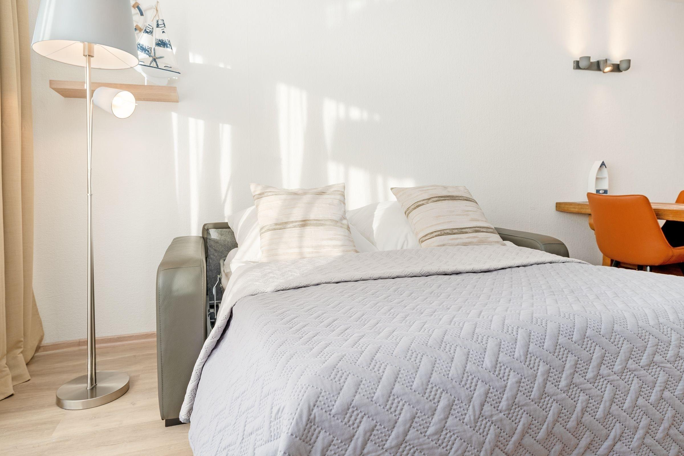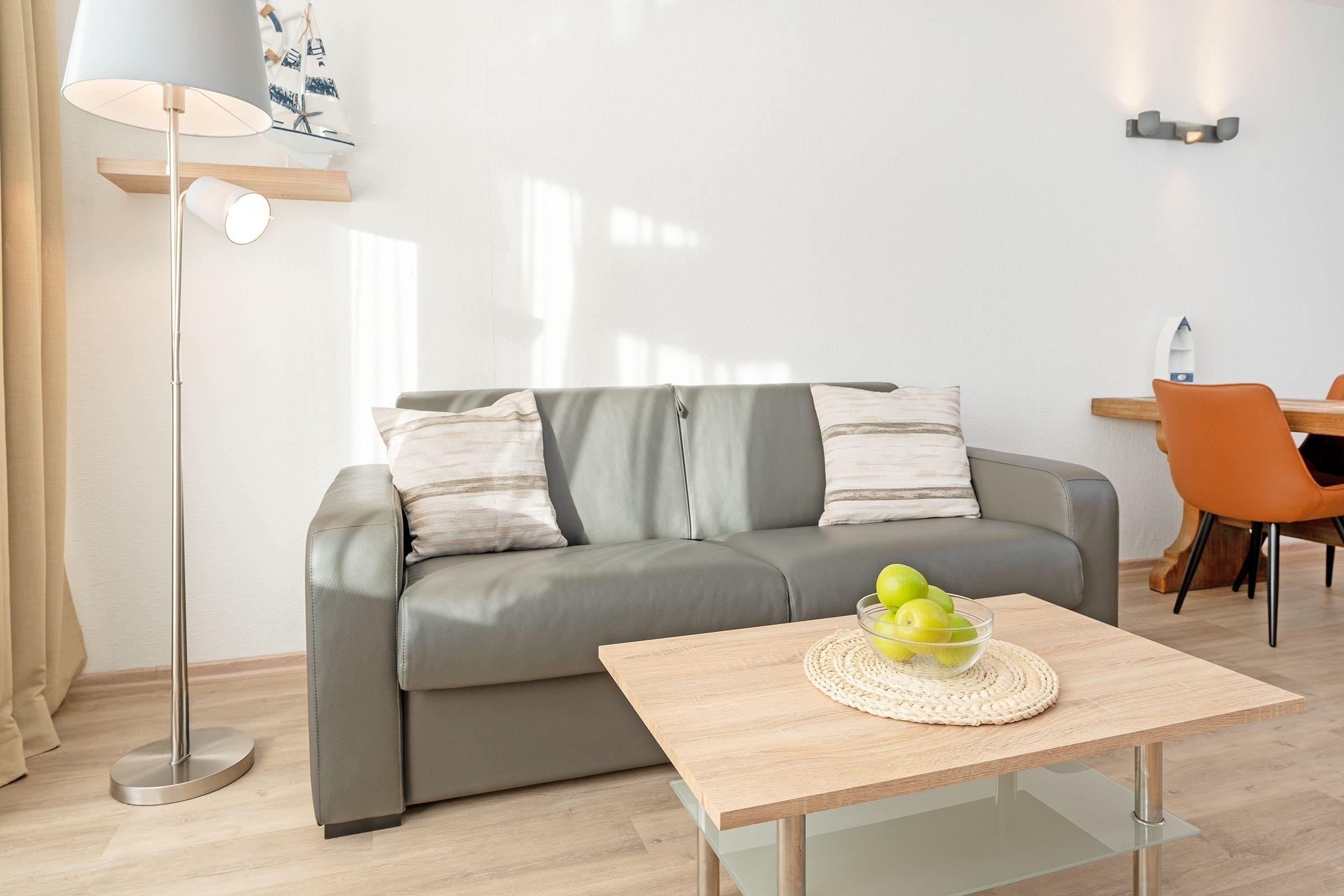 Herzlich willkommen in dieser schönen Ferienwohnung - ideal für einen entspannten Ostseeurlaub. Der helle Wohnbereich lädt mit einer gemütlichen Sofaecke und einem Flachbild-TV zum Verweilen ein. Der möblierte Balkon mit westlicher Ausrichtung bietet den perfekten Ort, um den Tag morgens mit einem Frühstück oder abends mit einem Glas Wein in der Abendsonne ausklingen zu lassen. Die angrenzende, moderne Küche ist gut ausgestattet und verfügt über einen Ceranherd, Backofen, Mikrowelle, Toaster und eine Kaffeemaschine. Ihre Speisen können Sie zusammen am großen Esstisch genießen. Das separate Schlafzimmer mit zwei Einzelbetten (2x 90x200 cm) sorgt für erholsame Nächte. Zudem lässt sich die Couch im Wohnbereich in ein komfortables Bett (ca. 140x200 cm) verwandeln. Das innenliegende, moderne Duschbad ist hell gefliest.