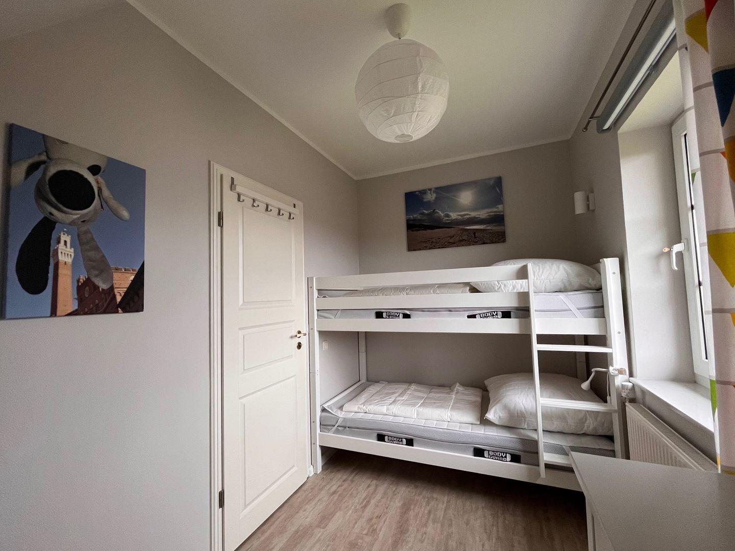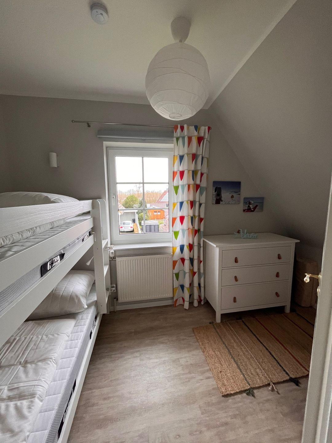 Für erholsame Nächte stehen Ihnen drei geschmackvoll eingerichtete Schlafzimmer zur Verfügung. Im ersten Schlafzimmer im Obergeschoss erwartet Sie ein komfortables Doppelbett mit separaten Matratzen, ein geräumiger Kleiderschrank, ein Stuhl zur Ablage und ein Fernseher. Das zweite Schlafzimmer verfügt über zwei Einzelbetten, einen Kleiderschrank und einen weiteren Stuhl zur Ablage. Im dritten Schlafzimmer finden Sie ein Etagenbett und ein Babybett für die kleinen Gäste sowie eine Kommode. Hier können sich alle ausruhen und neue Energie für spannende Urlaubstage tanken. Vorhänge sorgen für eine angenehme Verdunkelung und Privatsphäre.