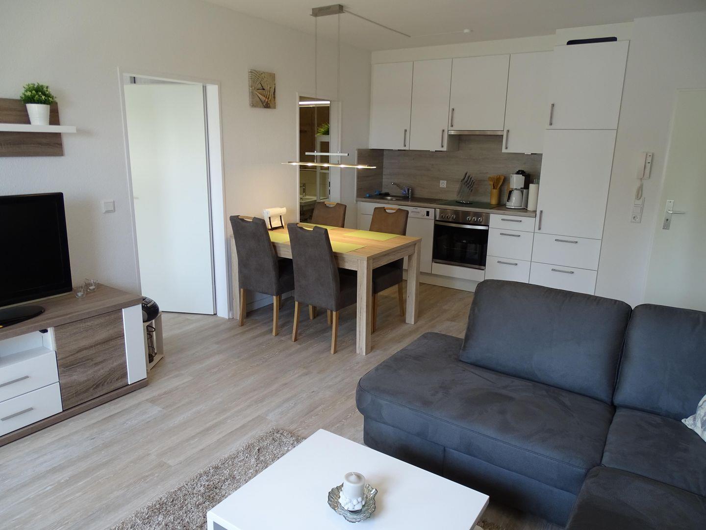 Das gemütliche Wohnzimmer lädt zum Entspannen ein. Auf der großzügigen Schlafcouch können Sie es sich bequem machen und Ihre Lieblingsserie auf dem Flachbildfernseher mit SAT-TV verfolgen. Vom Wohnzimmer aus haben Sie direkten Zugang zum möblierten Balkon, auf dem Sie die Sonnenstrahlen und den Ausblick auf das Meer genießen können.