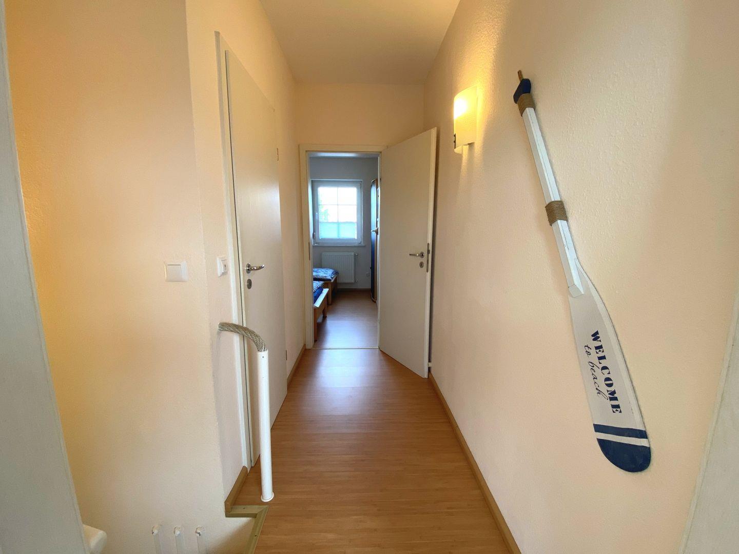 Die Wohneinheit für 4 Personen besticht im Erdgeschoss ebenfalls mit einem offenen Wohnzimmer und einer voll ausgestatteten Küche. Der Zugang zur Terrasse lädt dazu ein, die frische Meeresluft und den schönen Gartenbereich mit viel Privatsphäre zu genießen. Im Obergeschoss befinden sich zwei Schlafzimmer, eines davon mit eigenem kleinen Bad en Suite und Balkon, sowie ein weiteres Badezimmer mit Dusche und Fenster.