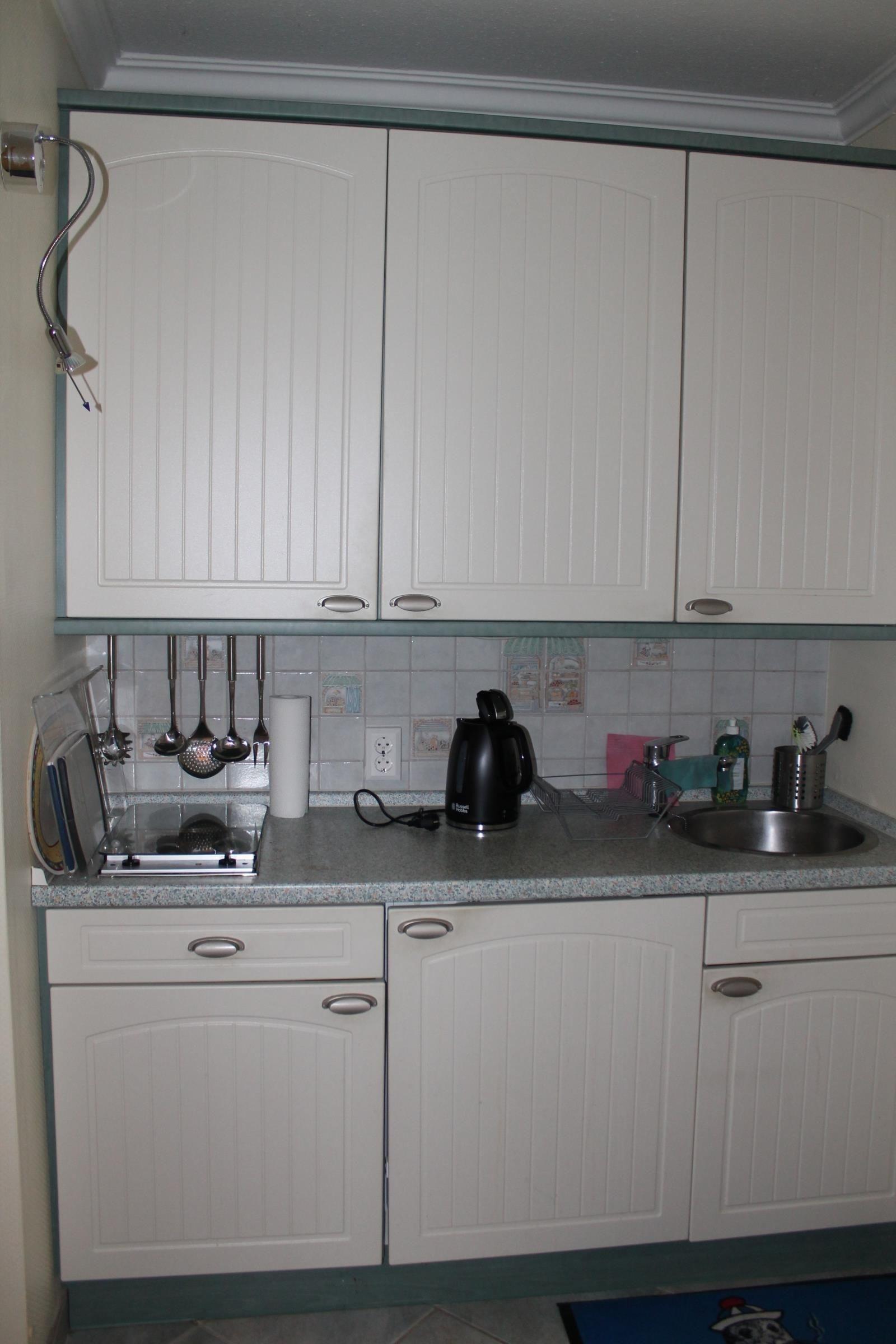 Im mit einem Vorhang abgeteilten Schlafraum steht ein Doppelbett. Die Küche der Ferienwohnung ist ausgestattet mit einem 2-Platten-Kochfeld, Mikrowelle, Kaffeemaschine, Toaster, Wasserkocher und Kühlschrank.