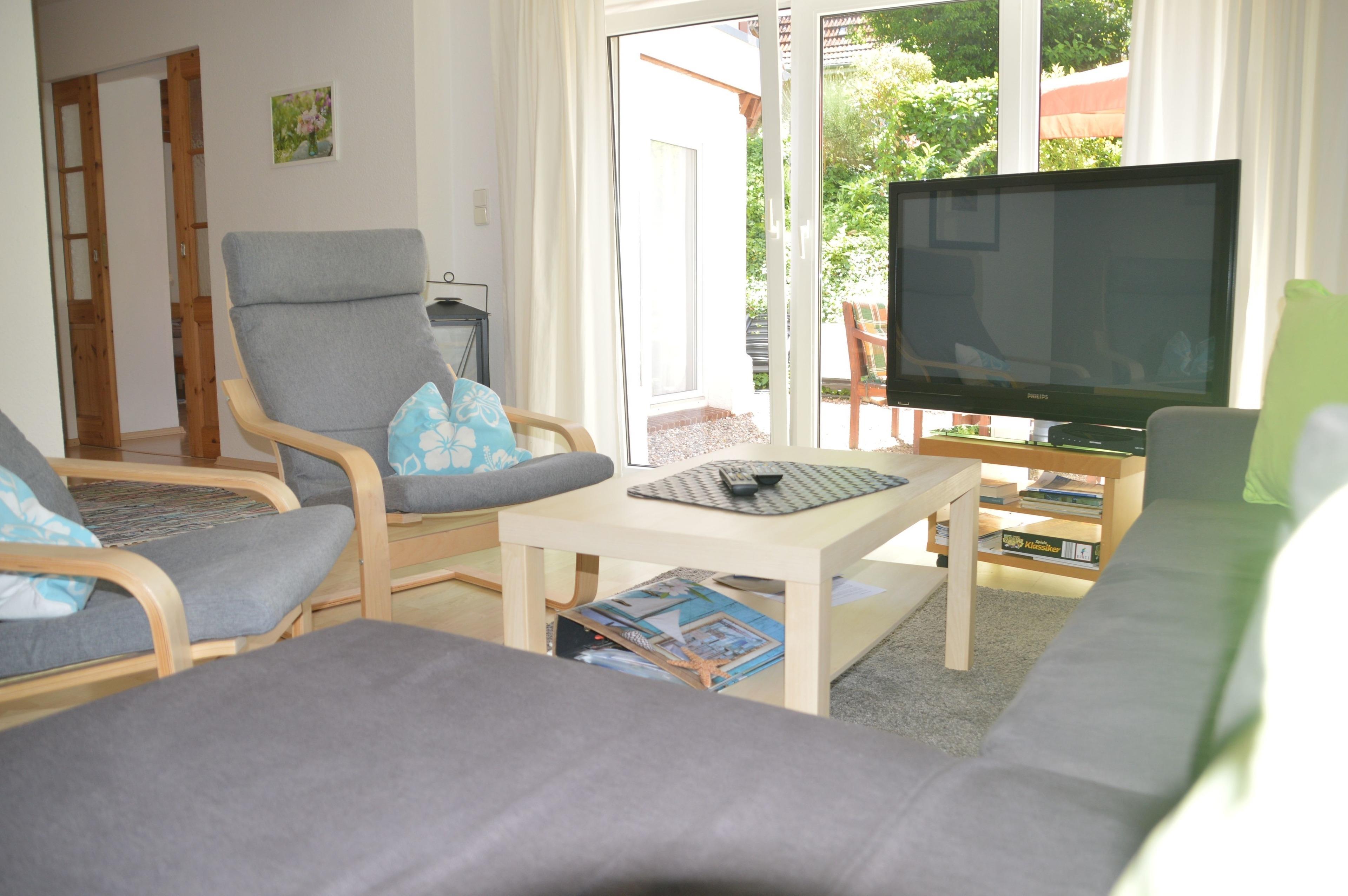 Auch das bequeme Sofa sowie die beiden Sessel laden zum Entspannen und Verweilen ein. Das Wohnzimmer verfügt außerdem über bodenlange Fenster, welche den offenen Wohnbereich mit Tageslicht erfüllen und einen Zugang zur Terrasse ermöglichen.