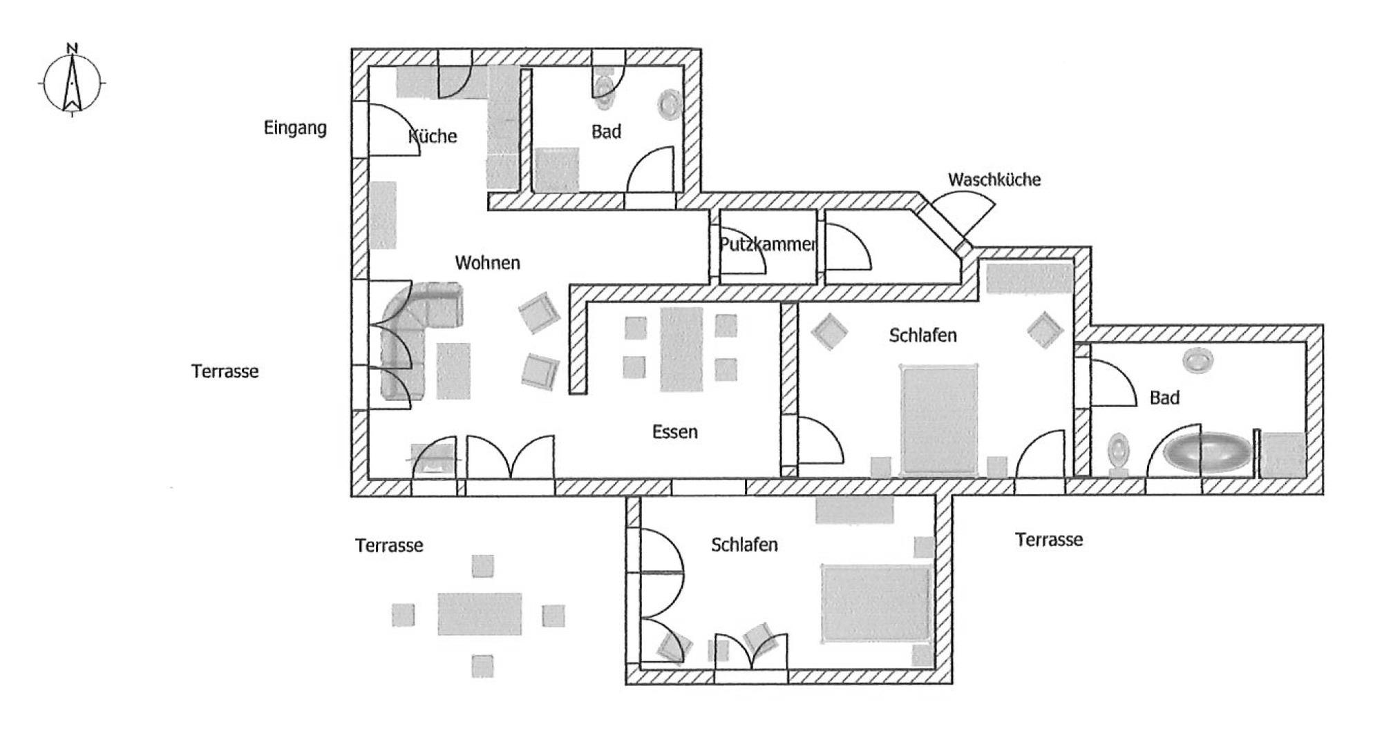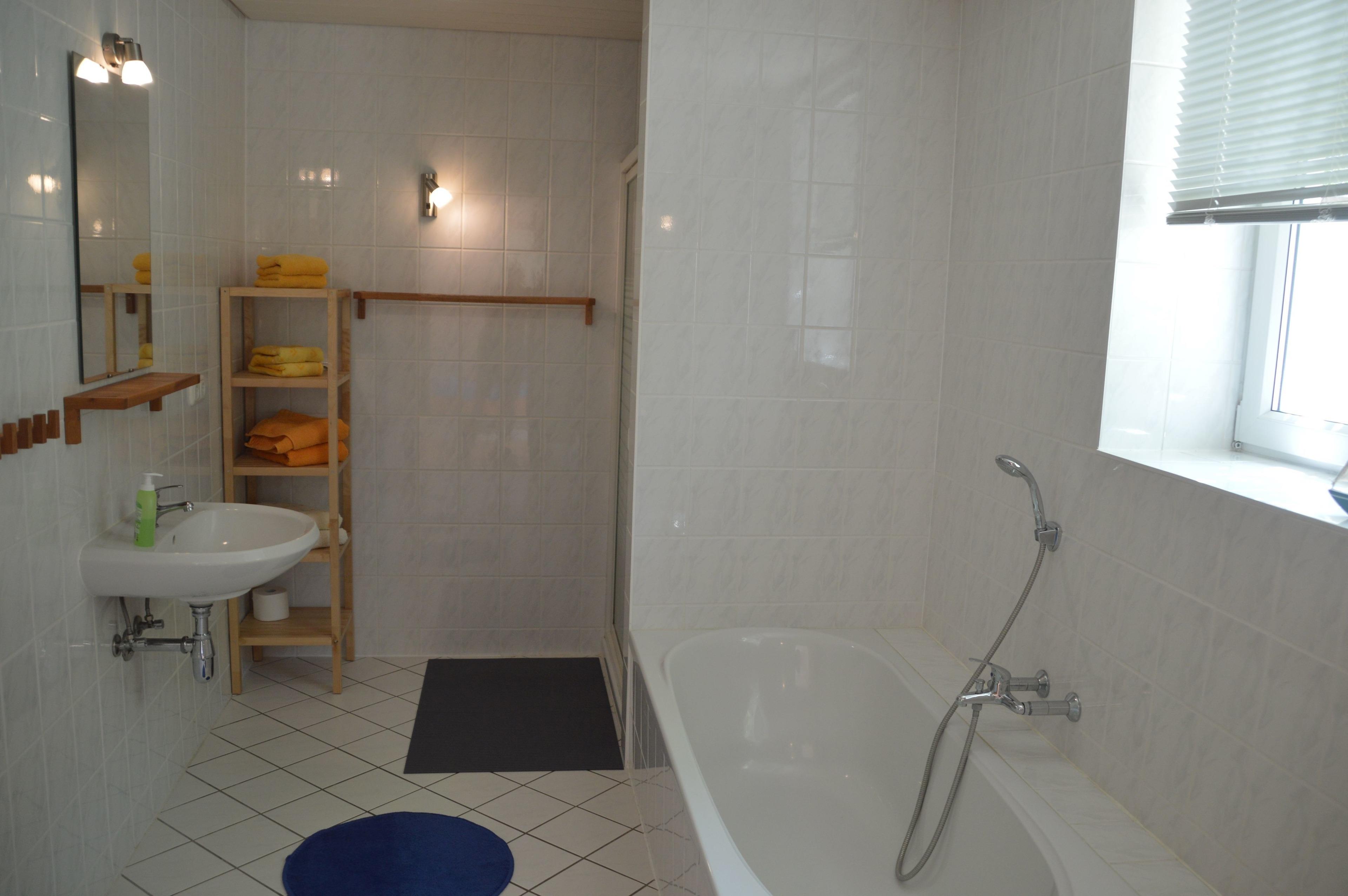 Auch die separaten Schlafzimmer, die jeweils mit einem Doppelbett mit den Maßen 1,40 x 2,00m und 1,80 x 2,00 cm ausgestattet sind, verfügen über bodenlange Fenster und einen Zugang zur Terrasse. Insgesamt gibt es zwei Bäder, die jeweils mit Dusche und WC ausgestattet sind. Ein Bad verfügt darüber hinaus noch über eine Badewanne, in der Sie sich nach einem Strandtag entspannen können. Das Angebot wird durch die Erstausstattung von Bettwäsche und Handtüchern abgerundet. Bei Bedarf steht ihnen darüber hinaus eine Waschmaschine zur gemeinschaftlichen Nutzung zur Verfügung.