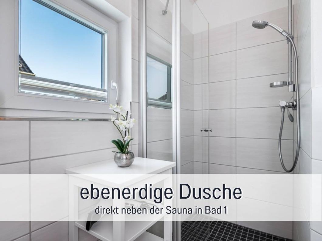 Für sechs Personen stehen zwei Bäder mit Dusche zur Verfügung. Ein Bad verfügt zusätzlich über einen Handtuchwärmer und die Sauna. Hier genießen Sie vor allem in der kalten Jahreszeit die wohltuende Wärme. In dem kleinen Abstellraum stehen eine Waschmaschine, Wäscheständer, Bügelbrett und Bügeleisen zur kostenlosen Nutzung bereit.