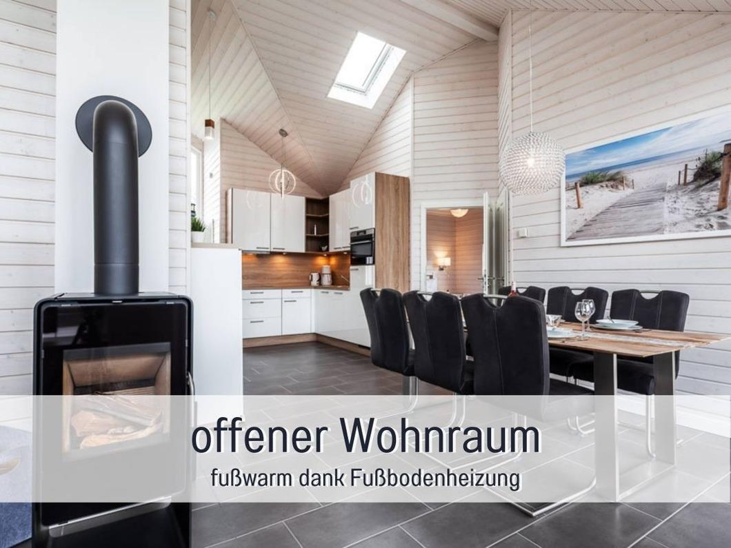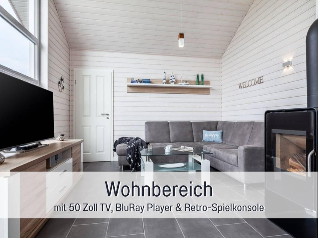Der offene Wohnbereich mit dem gemütlichen Ecksofa und einem Kaminofen befindet sich direkt vor der großen Fensterfront. Auf dem TV-Board finden Sie einen 50" Ultra HD TV. Ein Blu-ray-Player, ein Internetradio und eine Spielkonsole stehen Ihnen ebenfalls zur Verfügung. Die große Auswahl an Gesellschaftsspielen sorgt für gemütliche Runden an dem großen Esstisch.
