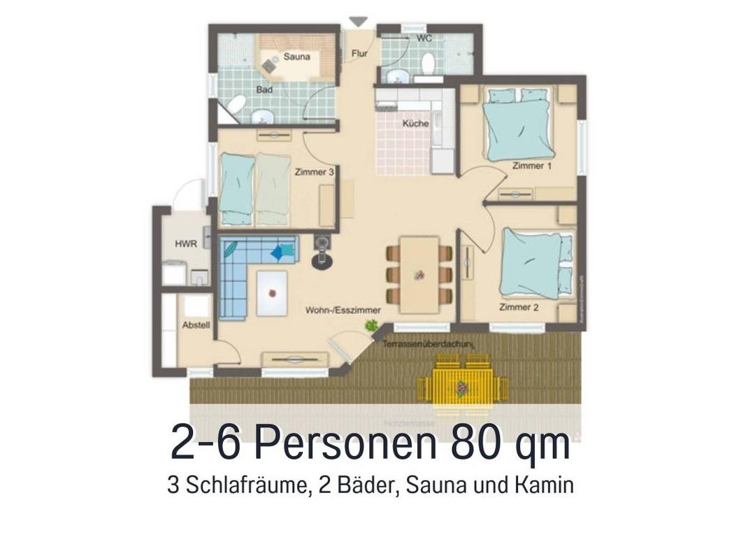 Unser 80 m² großes Ferienhaus für bis zu 6 Personen wurde modern eingerichtet und mit Liebe dekoriert. Durch die hohen Decken und die große Fensterfront ergibt sich ein großzügiges und helles Raumgefühl. Zur Ausstattung gehört eine im gesamten Haus verlegte Fußbodenheizung, die für eine gleichmäßige, angenehme Wärme sorgt. Besonders in den kälteren Monaten können Sie unsere eingebaute Sauna und den Kamin nutzen.