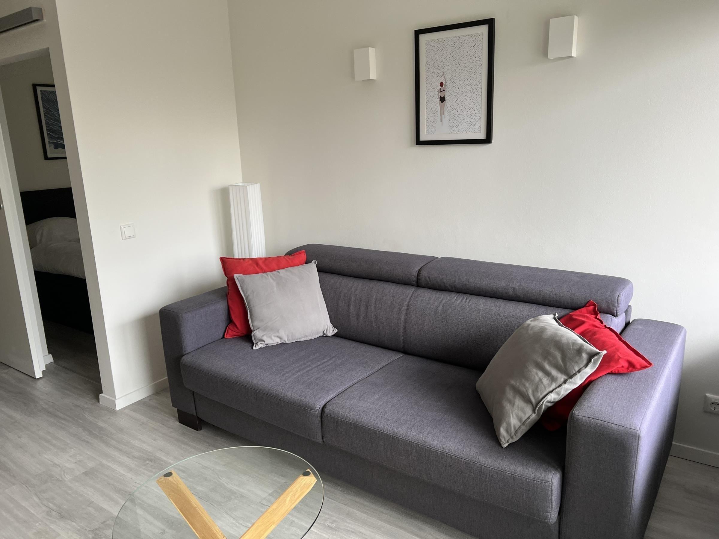 Im Wohnraum mit modernem Flair steht eine große Schlafcouch, die zu 2 Schlafplätzen umgebaut werden kann.